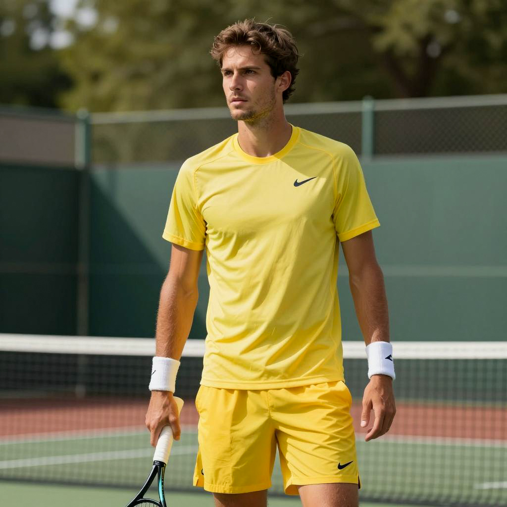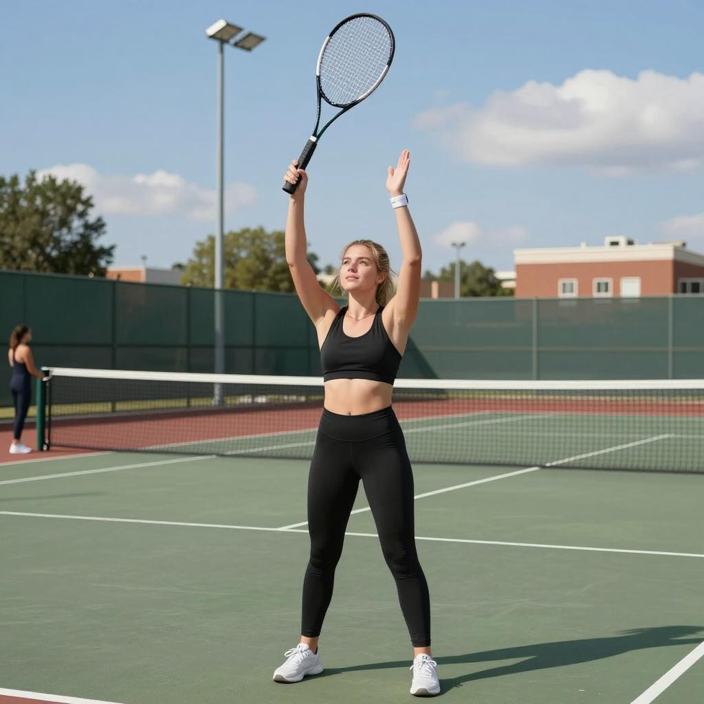 Woman playing tennis indoors, mid-swing, yellow ball in mouth. Wearing gray crop top, white skirt, holding two tennis rackets. Green netted background, green floor, wooden structure in background. Focused, athletic build, tan skin. Right arm extended, left arm back.