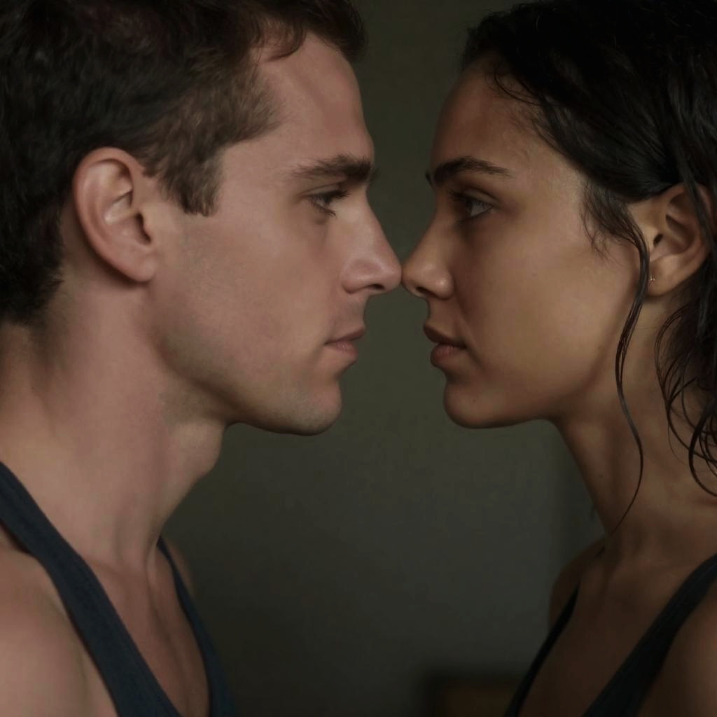 Blonde woman with wet hair, wearing a green, wet, long-sleeve shirt, holds a muddy, bald person with dark skin. Dark, ured background. She looks down with a concerned expression. Both figures are in a close, intimate pose.