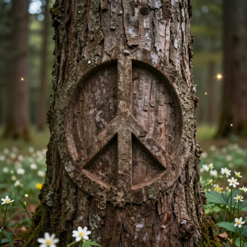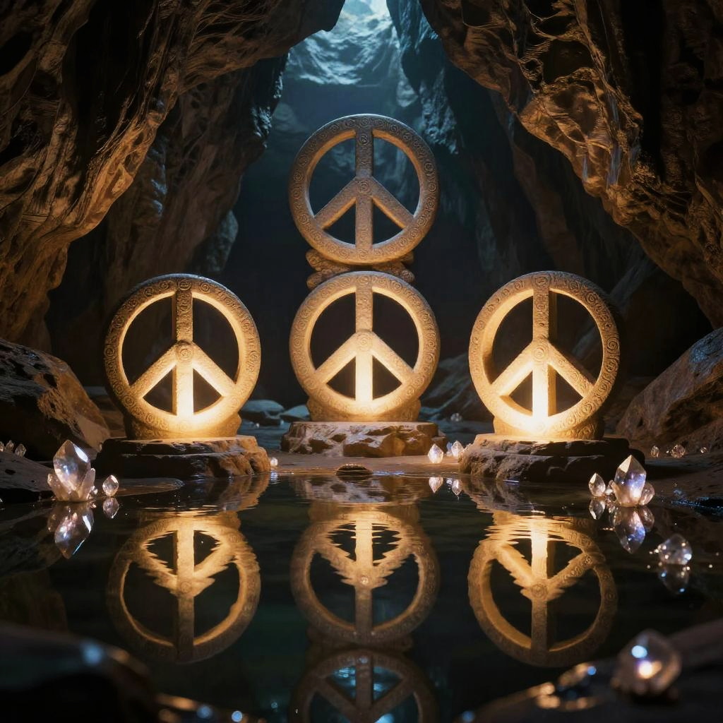 Ancient symbols of peace glowing softly in a dark cave, reflected in still water with sparkling crystals around, mystical ambiance, cinematic lighting, highly detailed environment