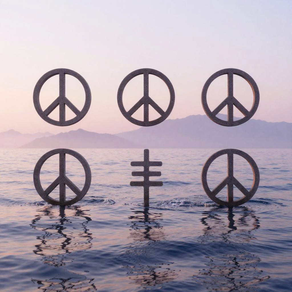 Photograph of three illuminated peace symbols stacked vertically in a dark, rocky cave. Each symbol is circular with a glowing, warm light emanating from within, casting reflections on the water below. The cave walls are rugged and textured, with a small opening at the top allowing a hint of blue twilight to filter in. Small, white fairy lights are scattered around the base, enhancing the mystical ambiance. The overall composition combines natural elements with a sense of peace and tranquility.