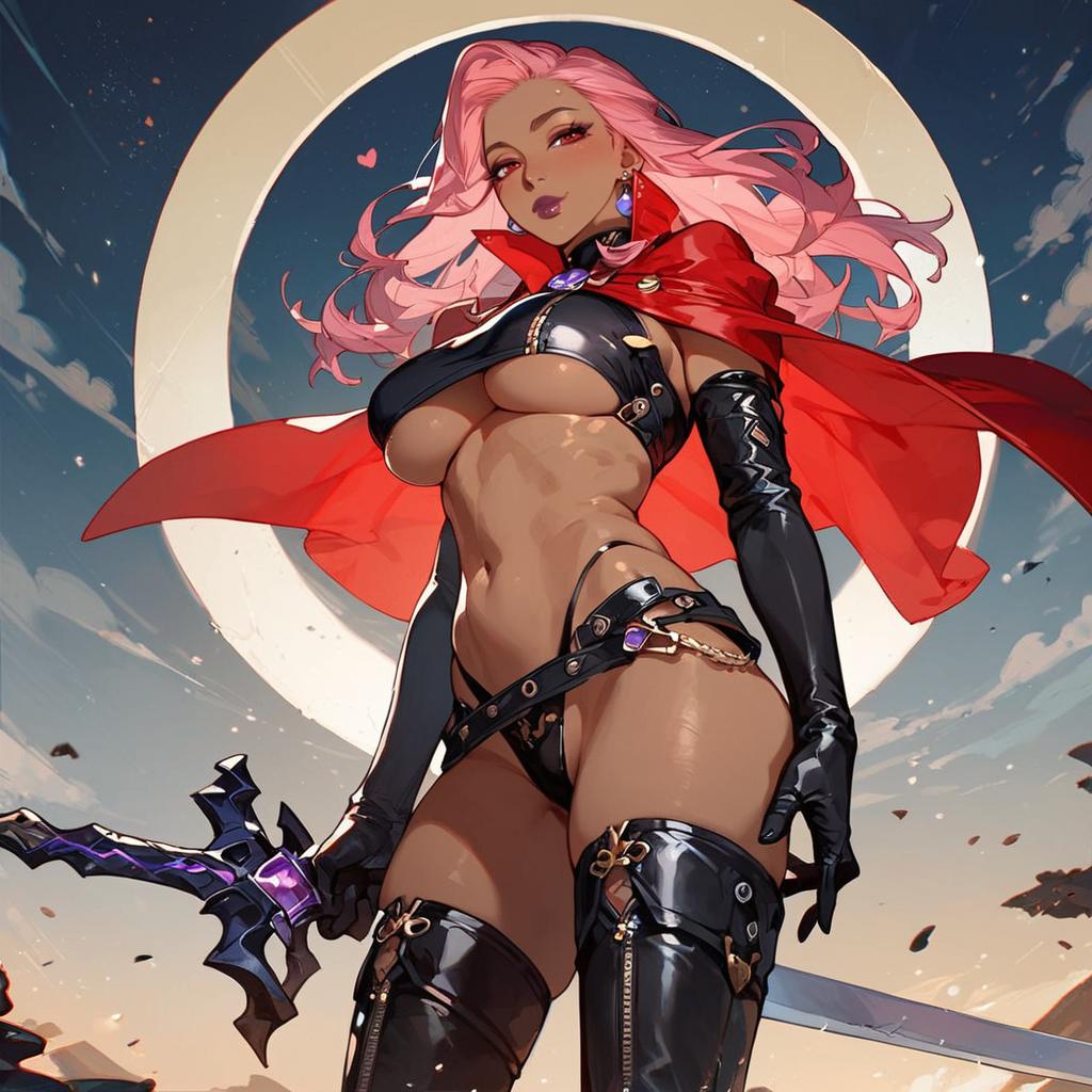 Digital artwork of a dark-skinned mature female warrior with long pink hair standing confidently outdoors at night. She wears a black leather underboob top, high-leg panties, elbow gloves, and thigh-high boots, complemented by a flowing red cape. The character holds a planted sword with intricate purple and black designs and looks at the viewer with a seductive smile and half-closed yellow eyes. The scene shows a large moon or circular light in the background and distant hills under a night sky.