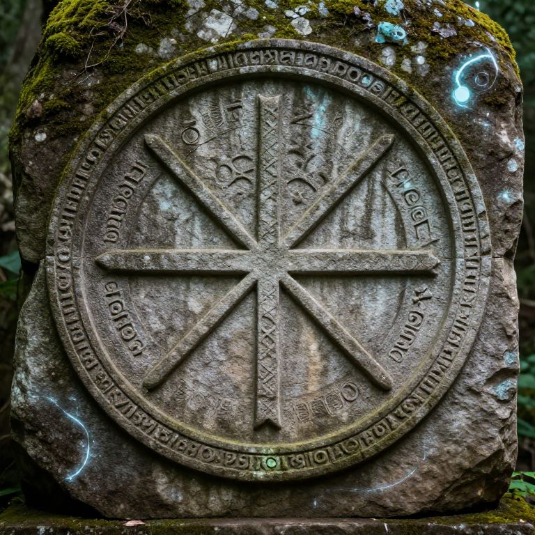 Ancient eightfold symbol carved in stone, weathered textures with moss and cracks, surrounded by mystical glowing runes and natural forest elements, capturing a fusion of history, spirituality, and natural beauty