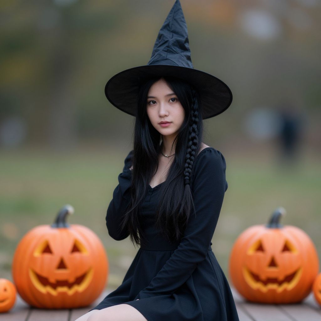 Photograph of an Asian woman with long black hair, wearing a black witch hat and bat wings, in a blurred urban background.