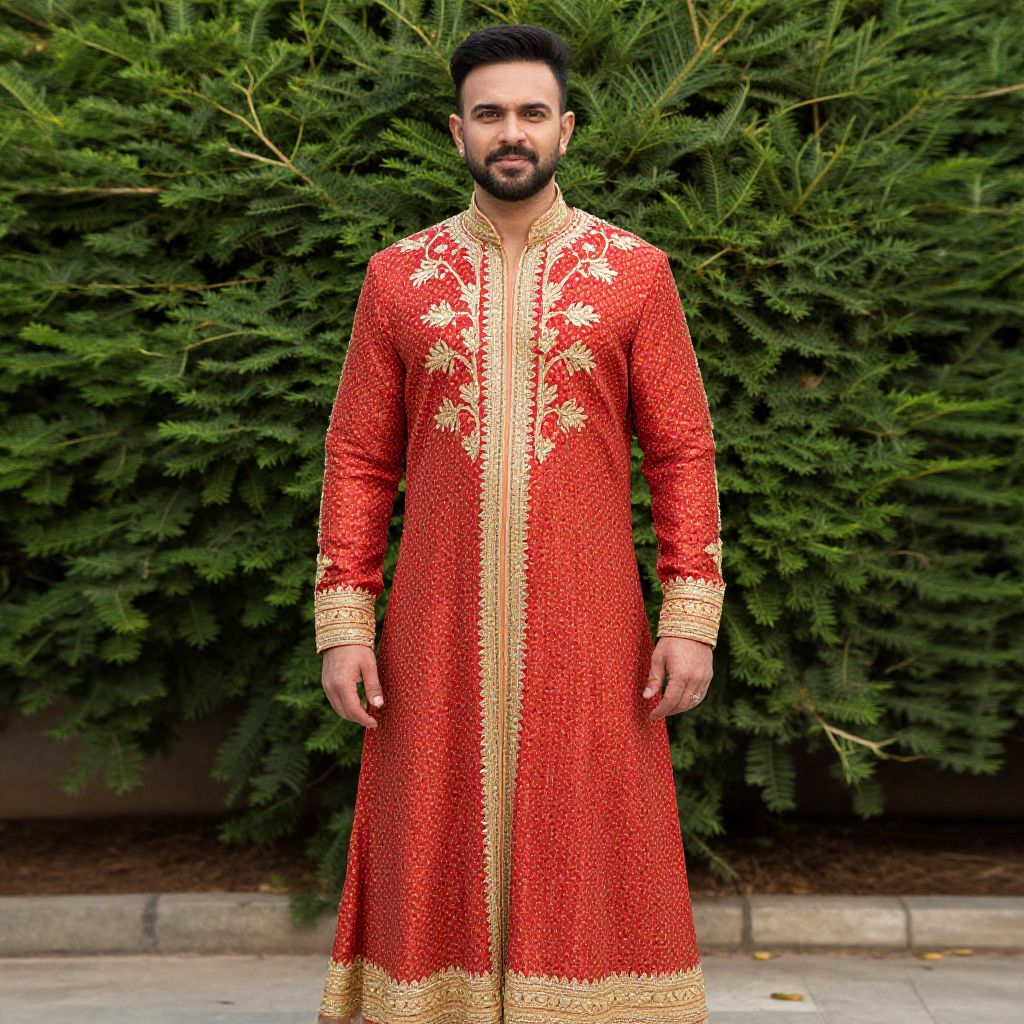 "Wear Marriage Party Costume, a man in a red and gold indian outfit standing in front of a bush"