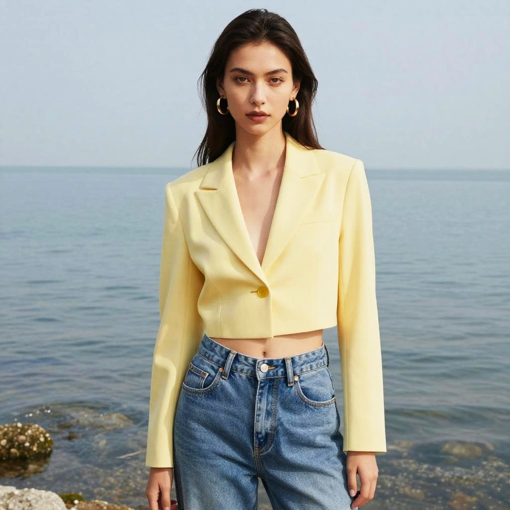 A lean woman in a contemporary chic cropped yellow blazer and high-waisted blue jeans, gold hoop earrings, and subtle make-up, stands by a crystal-clear lake inlet, captured in a witty studio visual style. Sexy. Pretty face and beutiful eyes