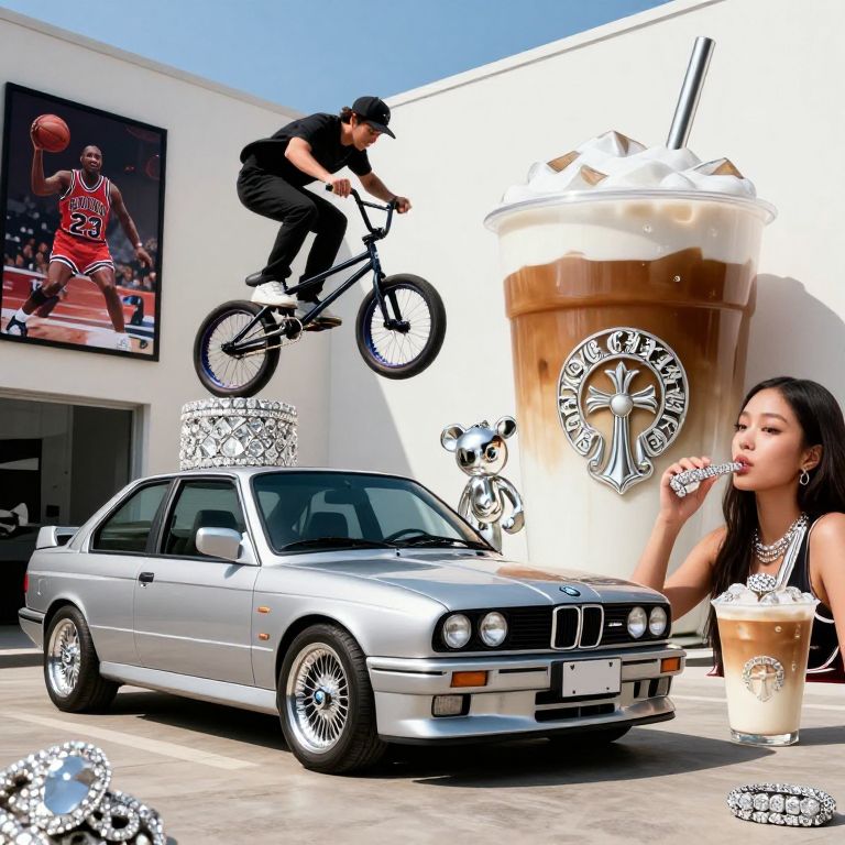 The image presents a vibrant and dynamic scene with a wide-angle perspective. In the foreground, a sleek, silver 1988 BMW E30 M3 is parked, its polished chrome wheels and body reflecting the bright sunlight. To the right, a giant chrome sculpture of a iced vanilla latte, styled in the fashion of Chrome Hearts, stands out with its intricate details and reflective surface. A street BMX rider is captured mid-air, bunny hopping over a bucket adorned with diamonds, adding a sense of motion and excitement to the scene. A Michael Jordan 23 poster is visible on the corner wall, contributing to the urban, sporty atmosphere. Palm Angels and a diamond grillz are scattered throughout, enhancing the luxurious and stylish vibe. A person, possibly Jenny from Black Pink, is depicted sipping on an iced vanilla latte with diamonds on top, further emphasizing the theme of luxury and fashion. The overall composition is hyper-realistic, with bright lighting and colorful elements creating a lively and engaging visual experience.