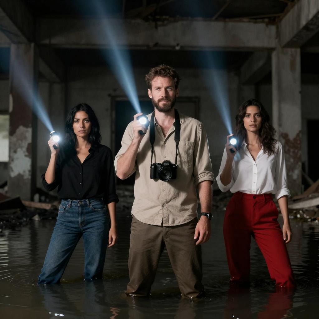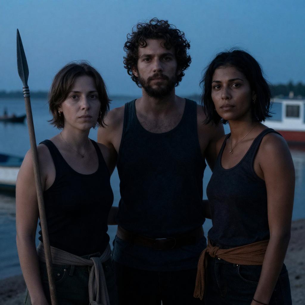 Photograph of three people standing closely together in a dimly lit, blue-tinted outdoor setting. A man with curly hair and a beard stands in the center, flanked by a woman with short brown hair on the left holding a spear, and another woman with short dark hair on the right. All wear sleeveless, dark clothing. Background shows blurred boats and water.