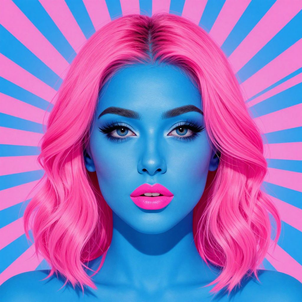 This is a digital pop art-style portrait of a woman with vibrant blue skin and wavy, neon pink hair. Her bright pink lips stand out against her blue face, and she has sharp, dark eyebrows and subtle eyeliner. The background is a burst of pink and blue radial lines, giving the image a dynamic, eye-catching feel. She looks directly at the viewer with a neutral expression.