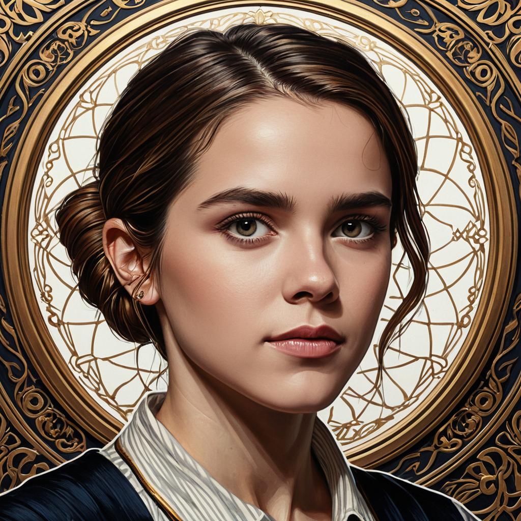 A hyperdetailed digital painting of a young woman with light skin and brown hair styled in a low bun, set against an intricate circular Art Nouveau-inspired background featuring gold and dark blue ornamental patterns. The subject wears a striped collared shirt with a dark jacket. The artwork is highly detailed, showcasing realistic facial features with sharp focus and elegant composition.