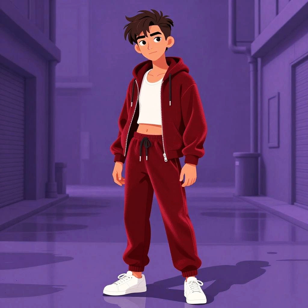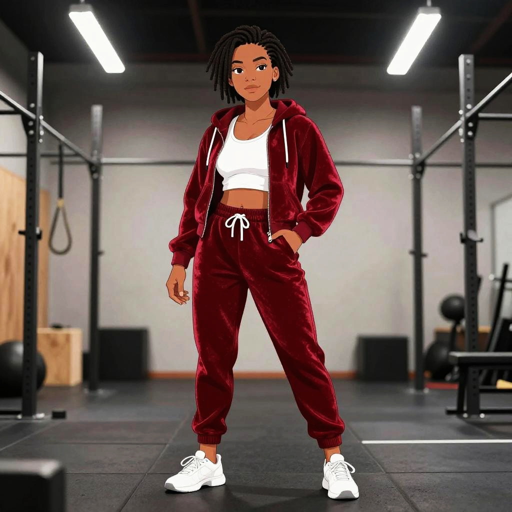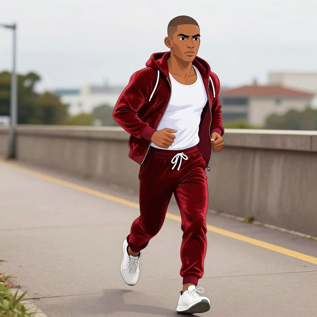 Athletic middle-aged man with salt-and-pepper hair, parking garage ramp with mixed artificial light, sporty casual red velvet tracksuit, hoodie with full zipper and drawstring, matching red sweatpants with elastic waistband and drawstring, cropped white tank top, white sneakers, muted harsh fluorescent lighting creating contrast, photorealistic, high detail, dynamic pose, subtle film grain, clean retouching, balanced composition, tactile fabric texture, editorial fashion vibe, color contrast, reflections and soft shadows, professional look, --sref 1461