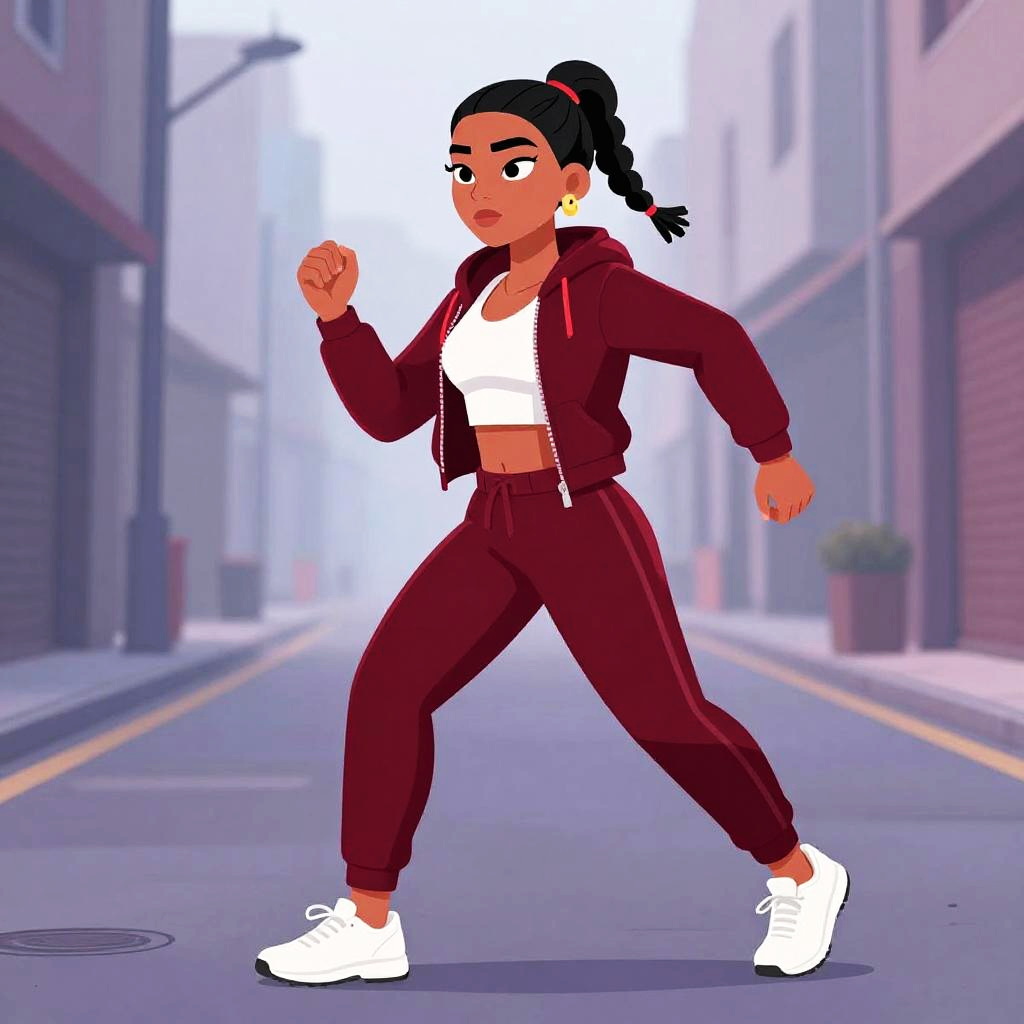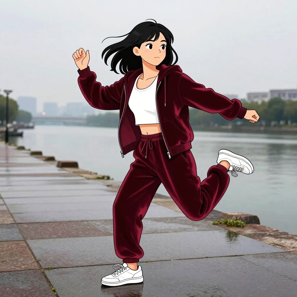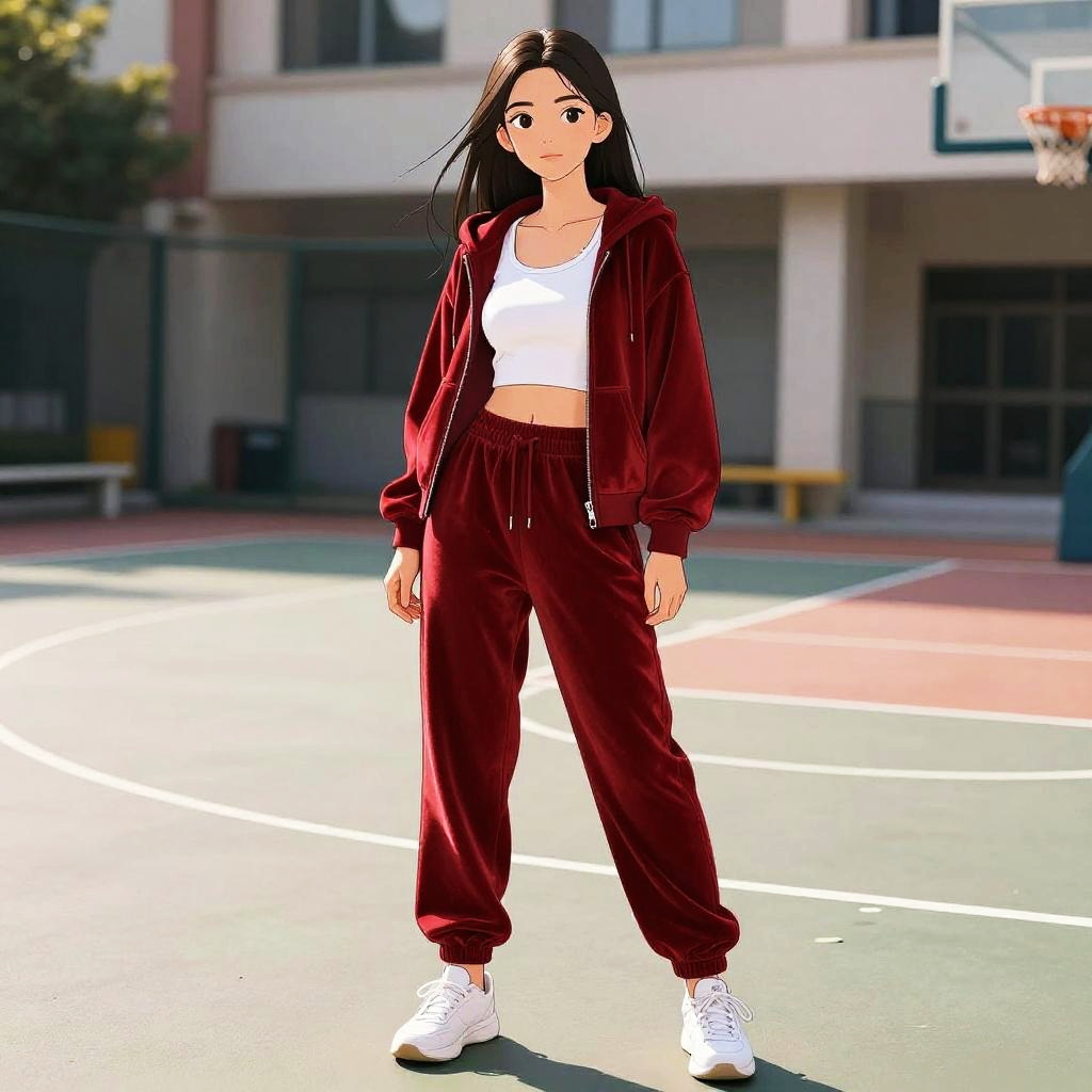 Athletic middle-aged man with salt-and-pepper hair, parking garage ramp with mixed artificial light, sporty casual red velvet tracksuit, hoodie with full zipper and drawstring, matching red sweatpants with elastic waistband and drawstring, cropped white tank top, white sneakers, muted harsh fluorescent lighting creating contrast, photorealistic, high detail, dynamic pose, subtle film grain, clean retouching, balanced composition, tactile fabric texture, editorial fashion vibe, color contrast, reflections and soft shadows, professional look, --sref 1461