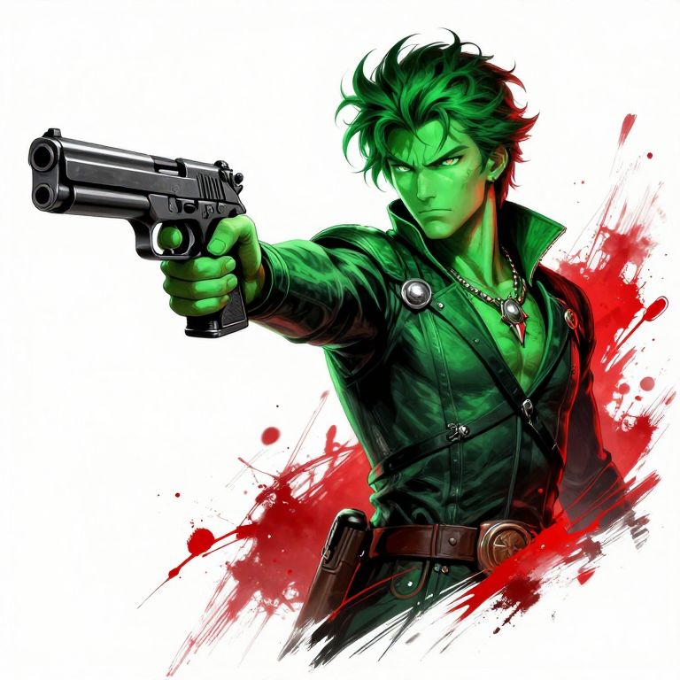 Anime-style digital artwork of a green-haired man in a dark jacket, firing a black handgun, with red splatters in the background. Intense expression
