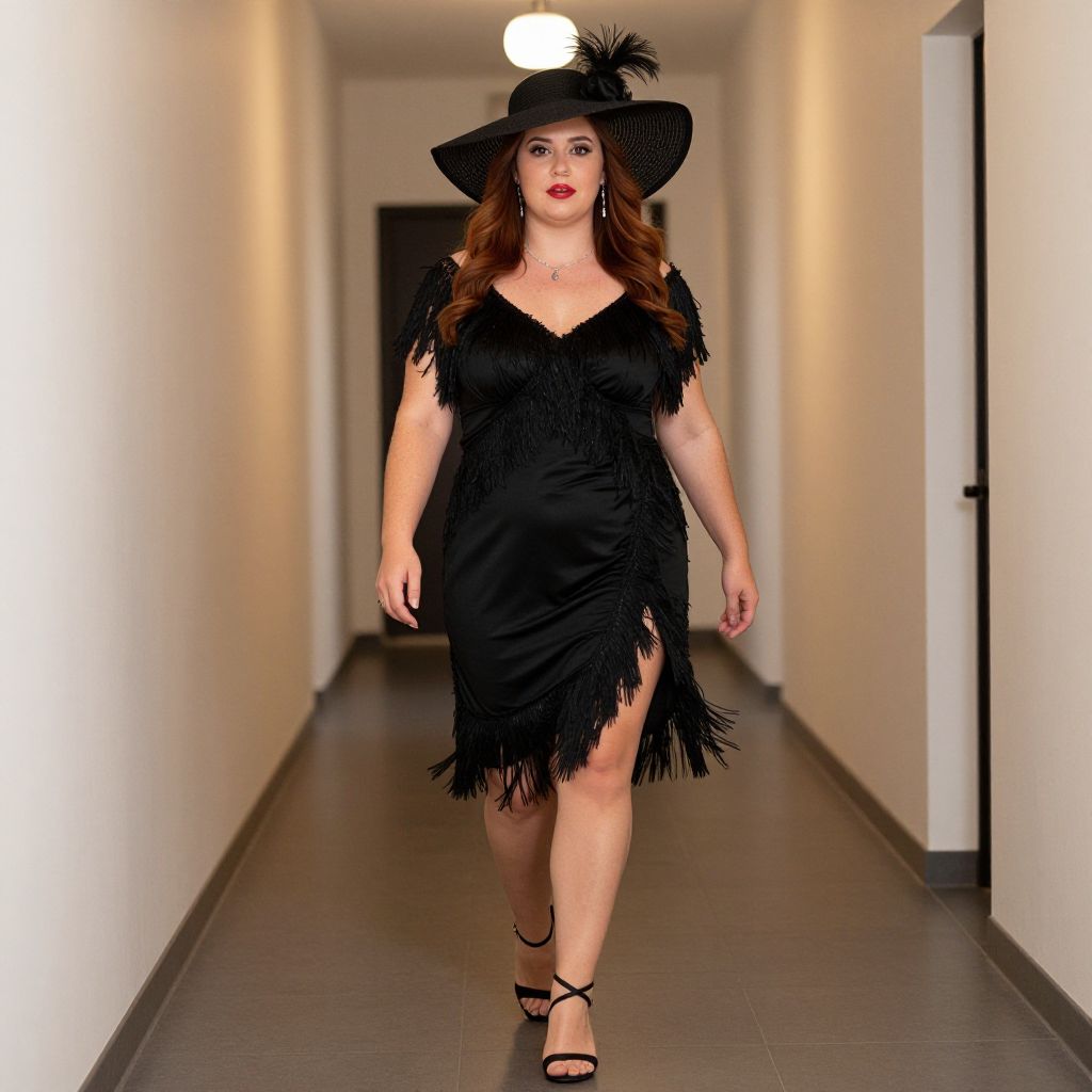 Photograph of a plus-sized woman with fair skin and long, wavy auburn hair, walking down a brightly lit, narrow hallway. She wears a black, fringed, knee-length dress with a deep V-neck, black strappy high heels, and a wide-brimmed black hat adorned with a feather. Her red lipstick and subtle eye makeup add a touch of glamour. The hallway has cream-colored walls and a dark grey floor, with a single overhead light fixture illuminating her path. The image has a slightly exaggerated, almost caricature-like style.