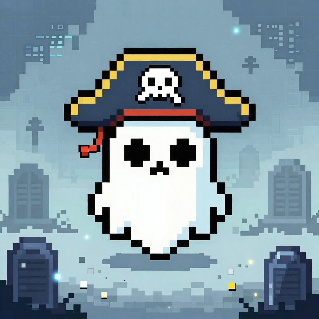 Pixel art retro ghost pirate skull in fog-bound forgotten cemetery, using icy blues and muted grays 16-color palette, retro 8/16-bit arcade vibe, sharp pixel edges, clean 1px outlines, deliberate checker dithering, subtle CRT bloom and scanlines, layered parallax tiles, soft pastel haze, tiny HUD glyphs, subpixel highlights on key features, balanced contrast, centered portrait sprite, reflections and light glints, consistent tile seams, nostalgic game intro energy