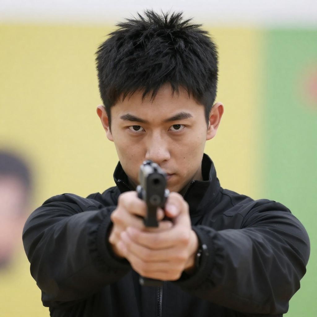 Photograph of two men in an indoor setting. The man in front holds a gun, aiming forward, with a determined expression. The man behind him, with a serious expression, grips the front man's shoulder. Background includes wooden doors and a partially visible person.
