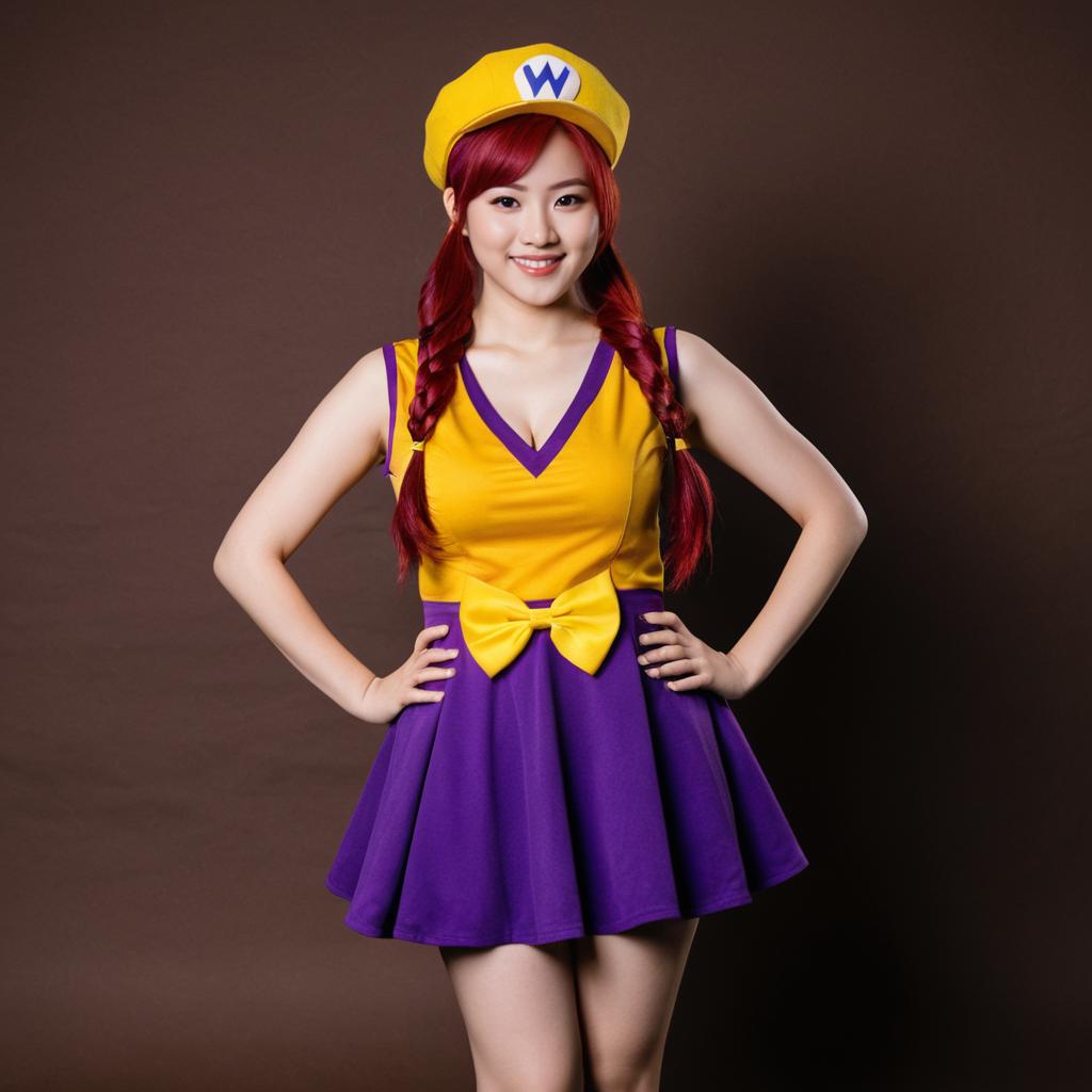 Full body portrait of a young Asian woman wearing a Wario-inspired anime-style cosplay costume. The outfit features a sleeveless purple and yellow dress with a yellow bow tie at the waist, a V-neckline, and a matching yellow and white hat with a blue 'W' emblem. She has long red hair styled in pigtails, fair skin, and a slim build. The woman stands confidently with her hands on her hips against a plain brown studio background, smiling gently with realistic lighting and minimal shadows.