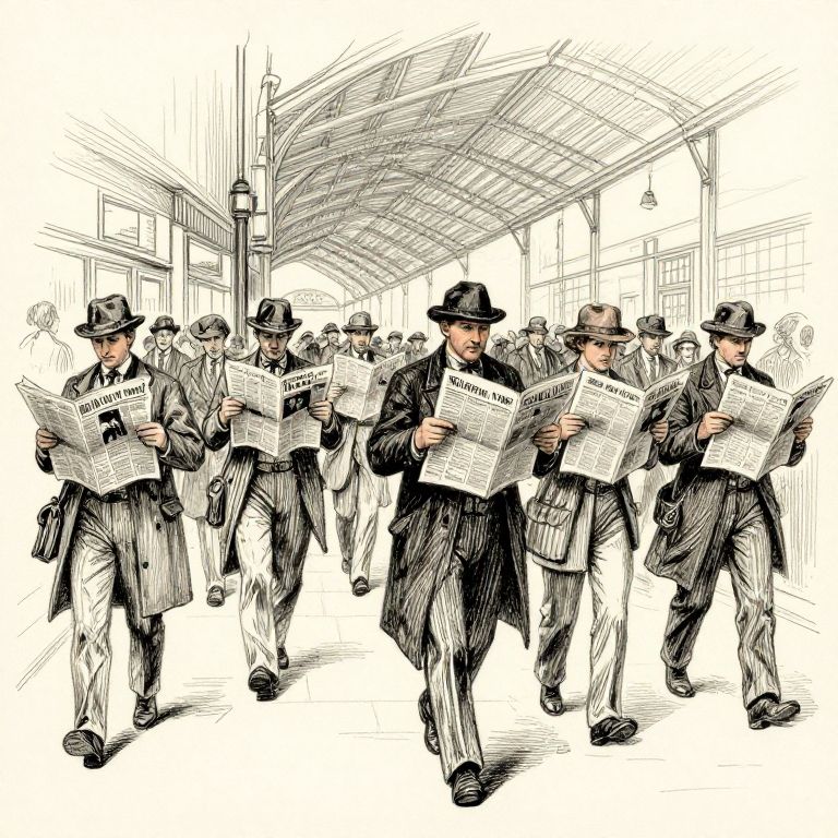 Manuscripts sketch ink draw illustration draw crowd of people walking reading big newspapers in train station , victorian era style, basic marker sketch , realistic sketch,