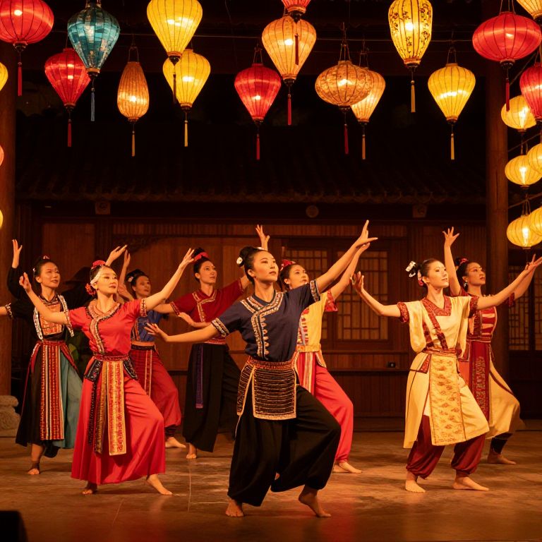 A diverse group of dancers in a festival setting, dressed in traditional attire, performing a synchronized routine under colorful lanterns, embodying the spirit of performing arts dance.