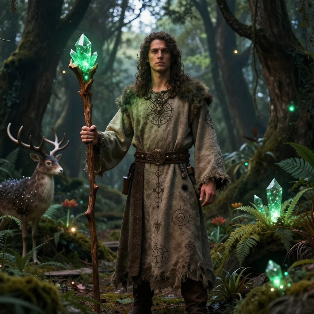 Fantasy male druid standing in an ancient enchanted forest, dressed in natural earth-toned robes adorned with mystical symbols, holding a wooden staff topped with glowing green crystals, surrounded by ethereal wildlife and magical glowing plants, twilight ambiance.