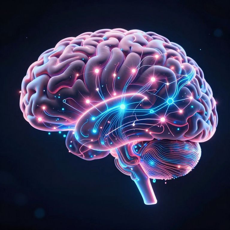 Digital CGI of a glowing, neon-colored human brain with vibrant pink, blue, and purple hues, interconnected with bright, luminous lines against a dark