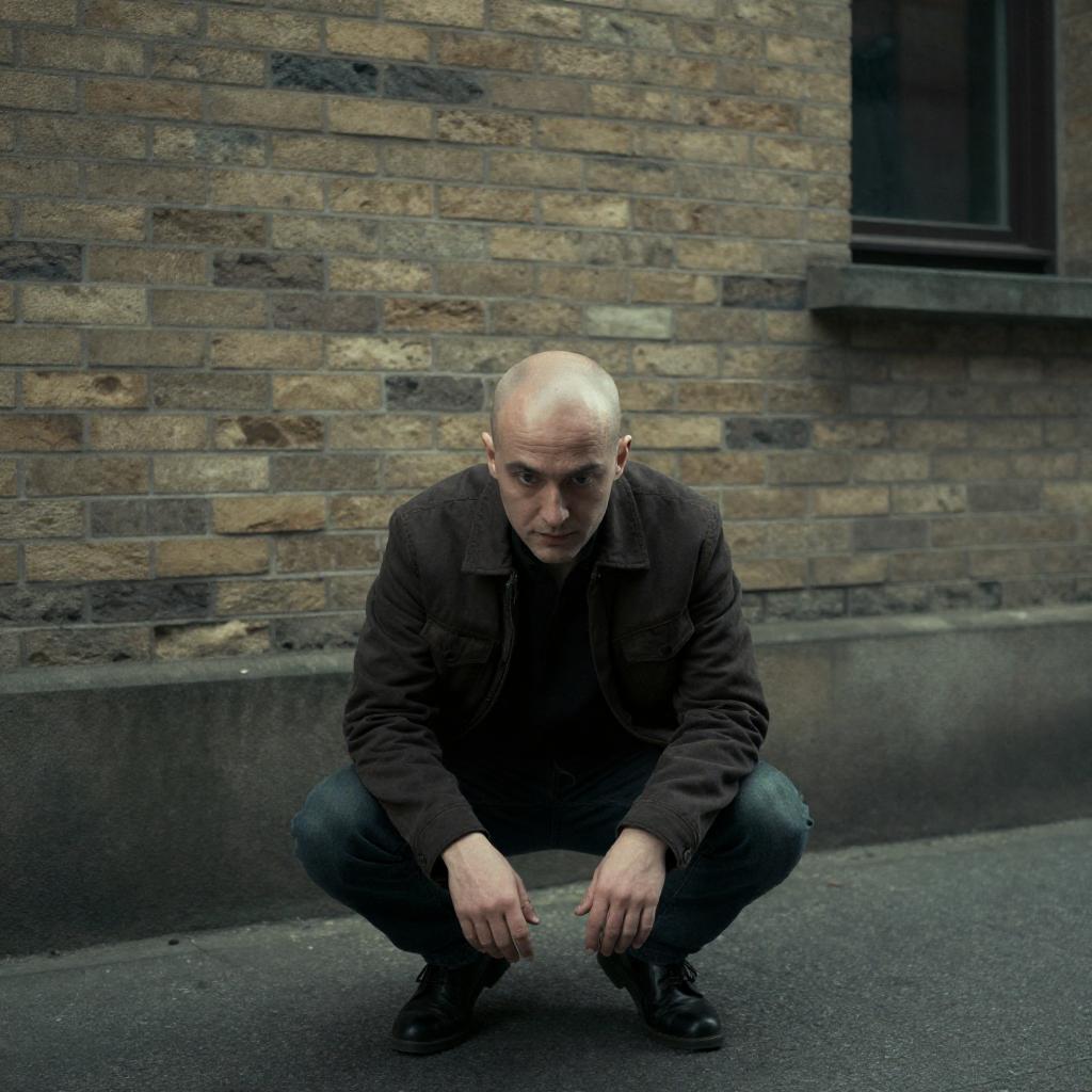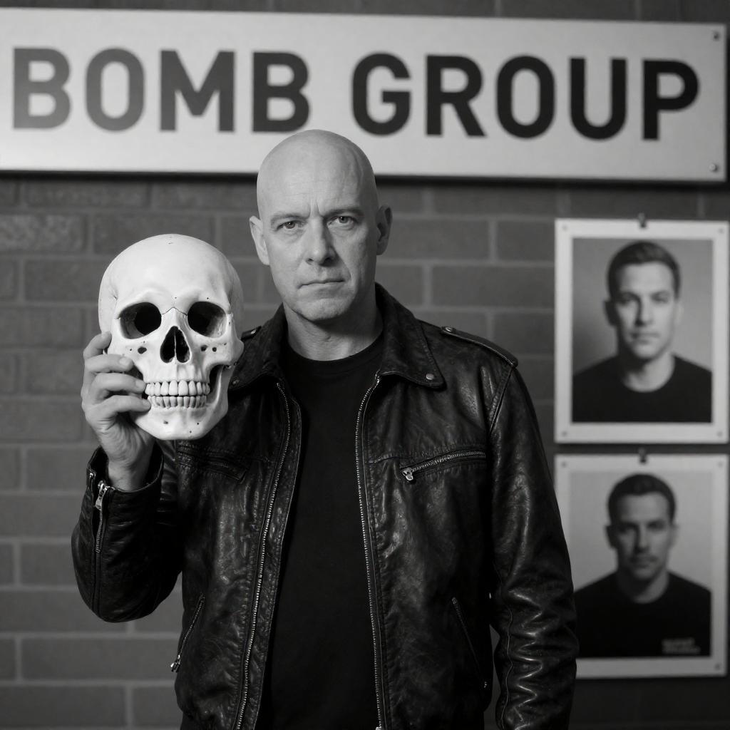 Man with balding head, wearing black suit, sitting in metal cylinder, dimly lit cavern with rough stone walls, tangled wires in background, light from doorway illuminates scene.