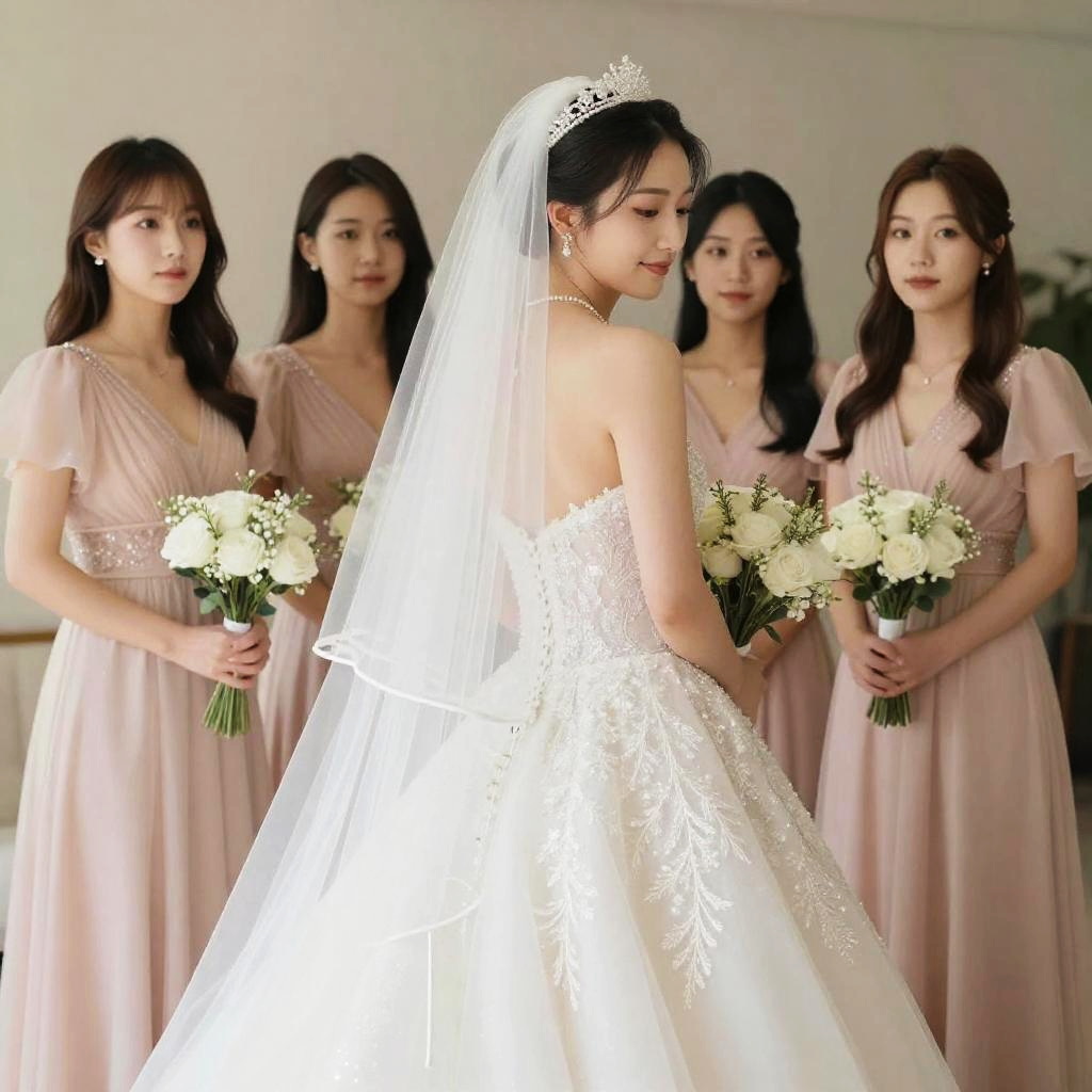 Something Borrowed Bridal, bride in white wedding dress holding bouquet in front of mirror