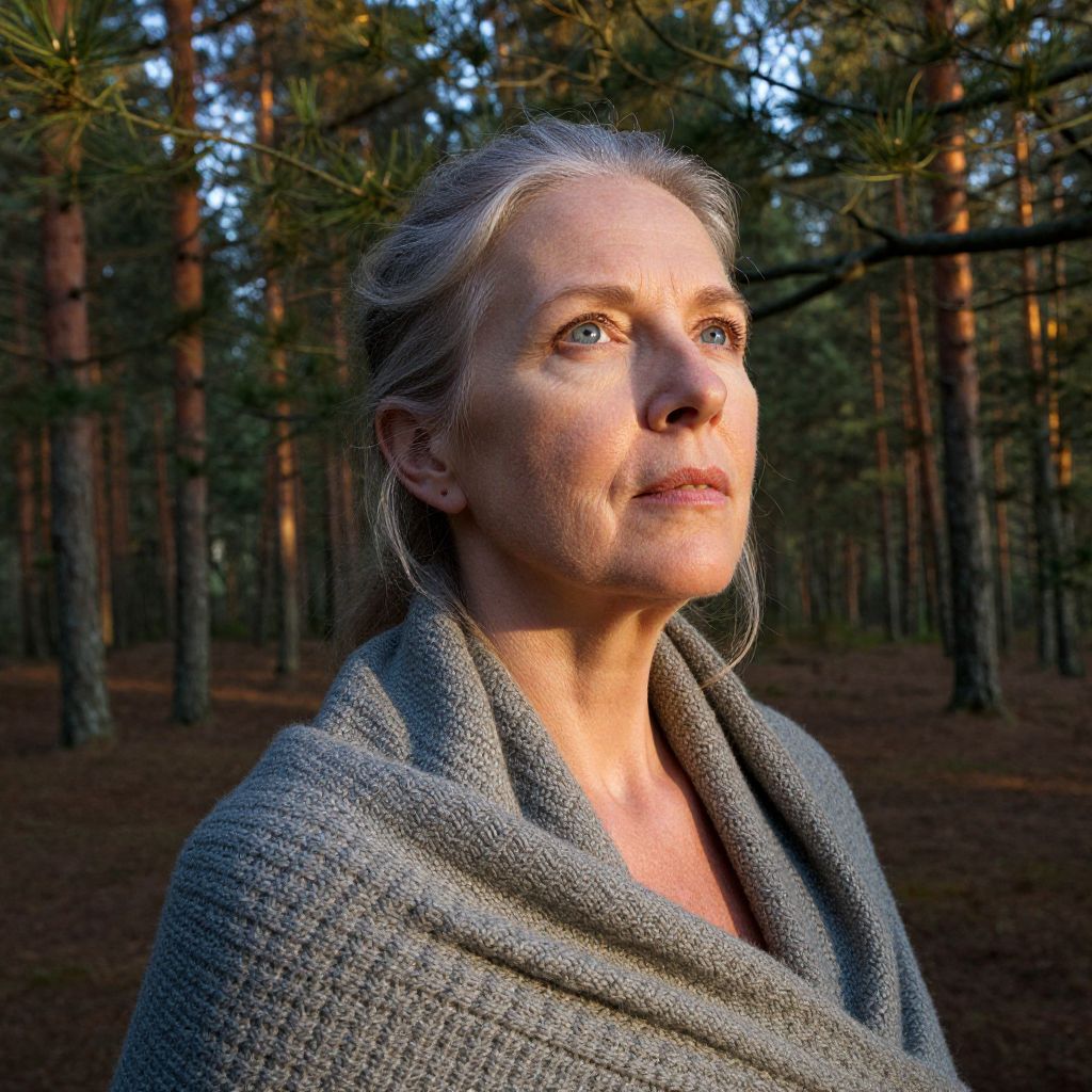 Photograph of a middle-aged woman with fair skin and gray hair, styled in a loose, natural manner. She is wearing a textured, gray knit shawl over a collared shirt. Her blue eyes gaze upwards to the right, illuminated by warm, late-afternoon sunlight filtering through a dense forest of tall pine trees. The background features a forest floor covered in brown pine needles, with the trunks of the trees creating vertical lines. The woman's expression is contemplative, and the lighting highlights the textures in her skin and clothing. The overall mood is serene and reflective.