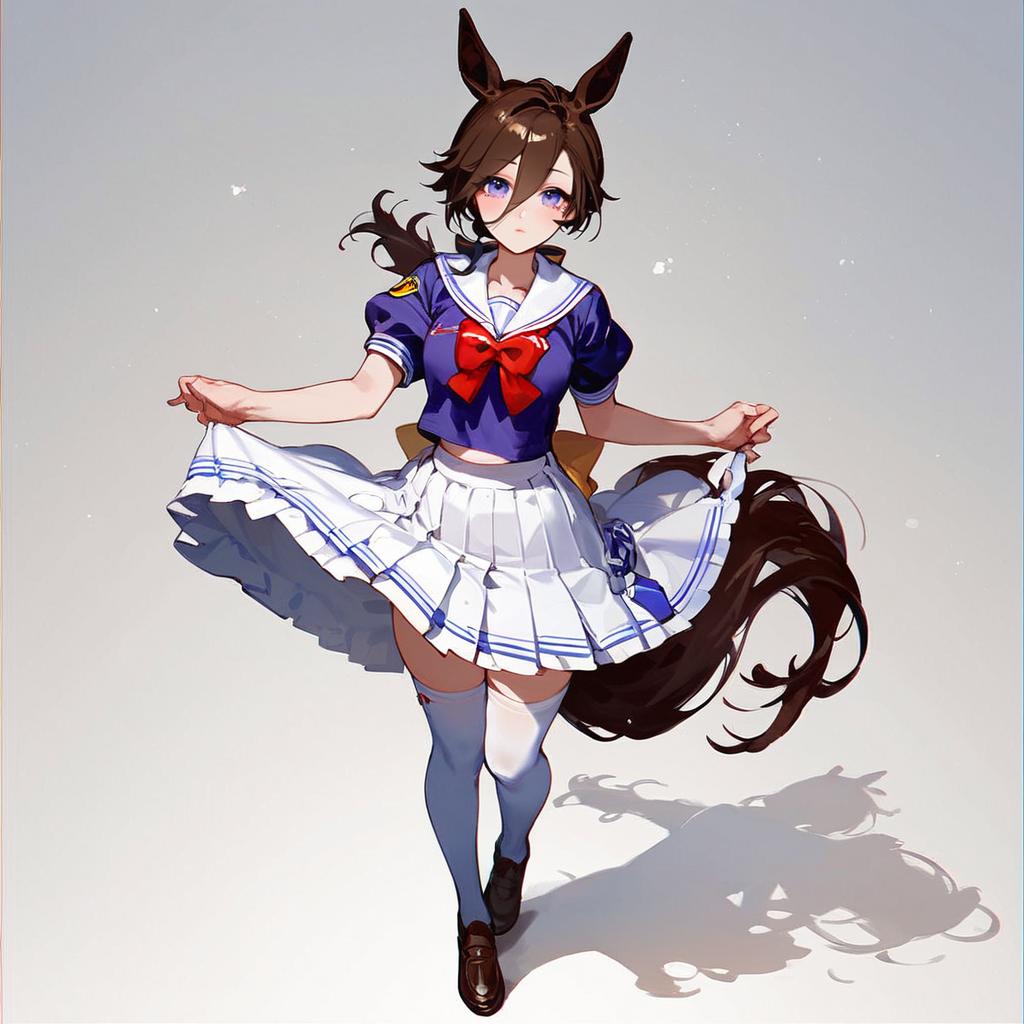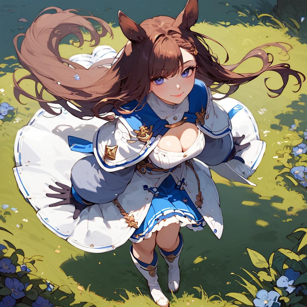 Score_9, score_8_up, score_7_up, source_anime grassland, shobufuku, 1girl, solo, long hair, looking at viewer, blush, smile, open mouth, bangs, blue eyes, skirt, brown hair, gloves, long sleeves, ribbon, animal ears, hair between eyes, very long hair, standing, jacket, tail, hair ribbon, ponytail, white hair, :d, multicolored hair, pleated skirt, boots, black gloves, white gloves, miniskirt, cape, two-tone hair, streaked hair, ascot, buttons, white footwear, white jacket, standing on one leg, white skirt, knee boots, horse ears, high ponytail, outstretched arm, horse girl, multicolored clothes, horse tail, pink ribbon, epaulettes, red cape, blue gloves, asymmetrical gloves, mismatched gloves, two-tone skirt, pink ascot, single epaulette, full body