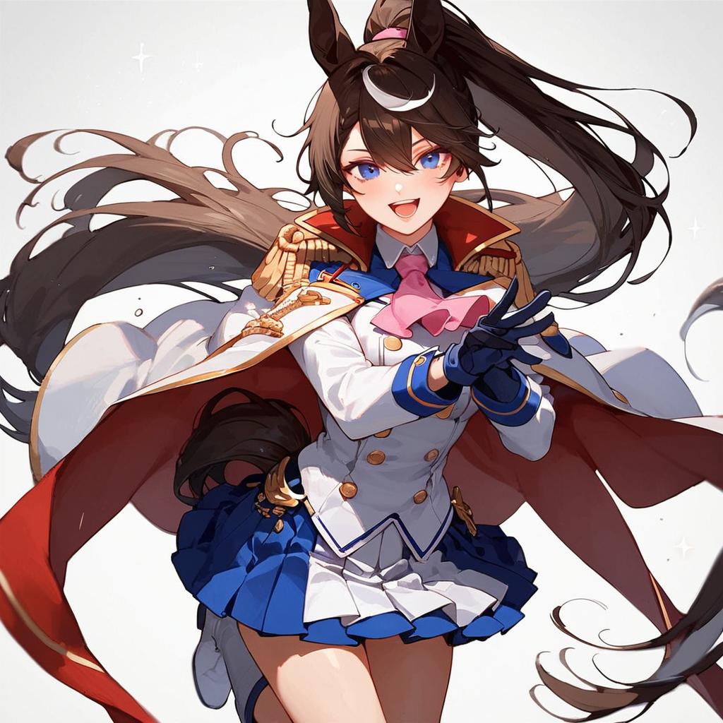 Digital illustration of a smiling anime-style horse girl with long, flowing brown hair and blue eyes. She wears a detailed military-inspired white jacket with gold epaulettes, a blue pleated miniskirt, a red cape, and mismatched blue and black gloves. Accessories include a pink ascot, pink hair ribbon, and knee-high white boots. The character has horse ears and a tail, standing dynamically on one leg with an outstretched arm.