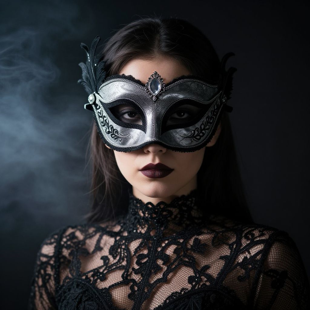 Photograph of a woman with dark hair, wearing a silver, ornate masquerade mask and black lace top, set against a dark, sm