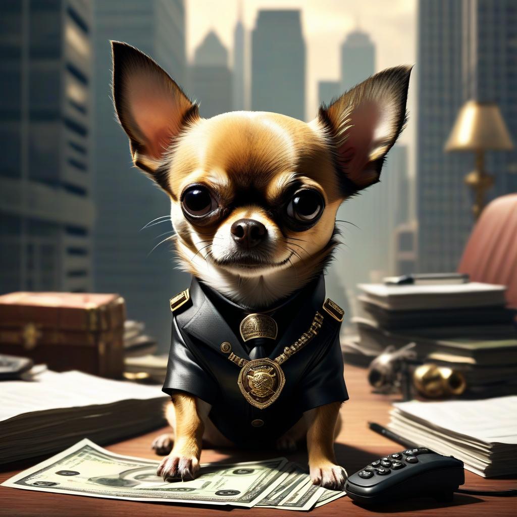 A digitally enhanced image of a Chihuahua dog dressed in a sharp black leather suit and tie, sitting at a table covered with stacks of US dollar bills. The background features a vibrant city skyline at twilight, with modern skyscrapers illuminated by golden lights, creating an atmosphere of wealth and power.
