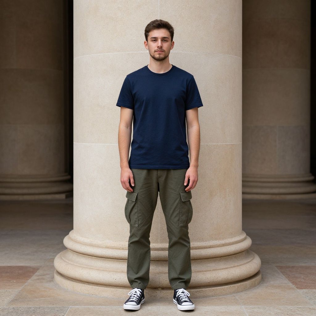 Photograph of a young man standing in front of a large beige stone column. He has short brown hair and a slight beard, wearing a plain navy blue t-shirt, olive green cargo pants, and black and white sneakers. The background shows more stone columns and a tiled floor, suggesting an outdoor or covered walkway. His expression is neutral, and the lighting is natural.