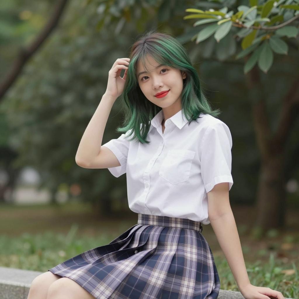 Asian woman with long purple hair, bangs, wearing a black sleeveless top, drinking from a clear plastic cup with iced tea, sitting outdoors, sunlight filtering through trees, blurry background, holding the cup with right hand, left hand resting on knee, wearing a necklace, serious expression, label "CKS-JAPAN" on left side.