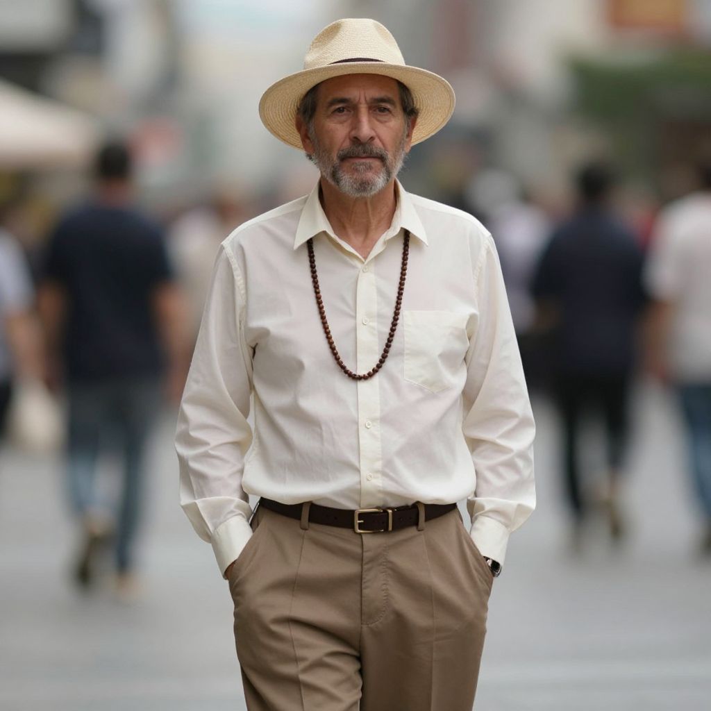 Photograph of an older man standing in a busy street. He has a grey beard and is wearing a straw hat, white long-sleeve shirt, beige pants with a black belt, and a black bead necklace. His hands are in his pockets, and he looks directly at the camera with a calm expression. The background is blurred, showing people walking and storefronts, indicating a bustling urban environment. The man's attire and confident stance suggest a relaxed, yet composed demeanor. The image is brightly lit with natural daylight.