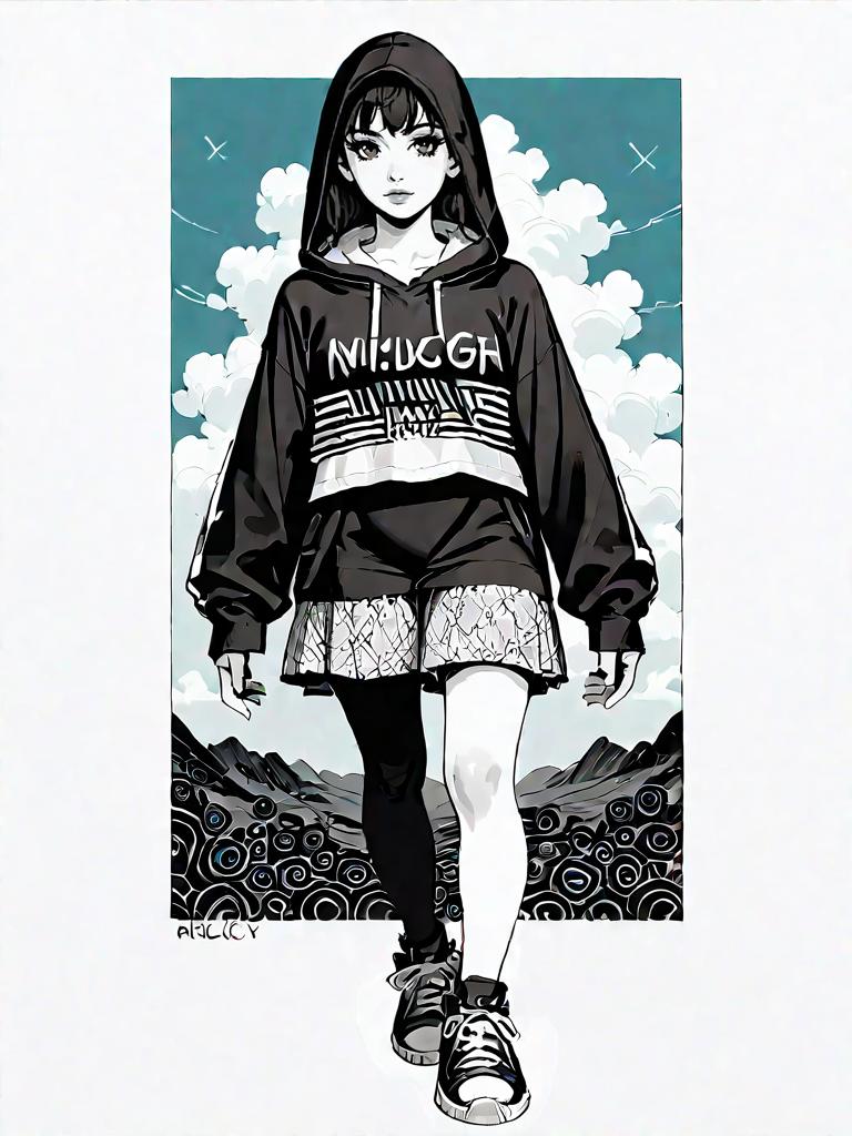 1girl, source_comics, realistic face, full body shot, Woman, streetwear, cropped black hoodie with white graphic text, checkerboard wrap miniskirt in black and white, frayed edge detail.