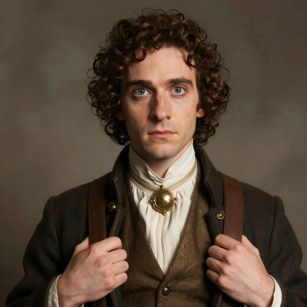 Photograph of a young, curly-haired man with blue eyes, wearing 19th-century attire, brown vest, white shirt, and suspenders,