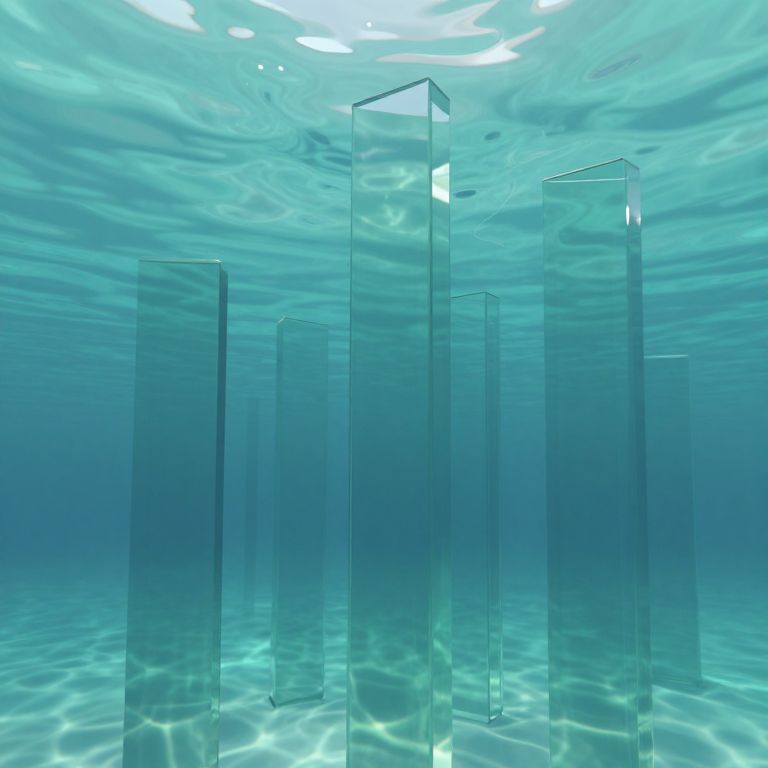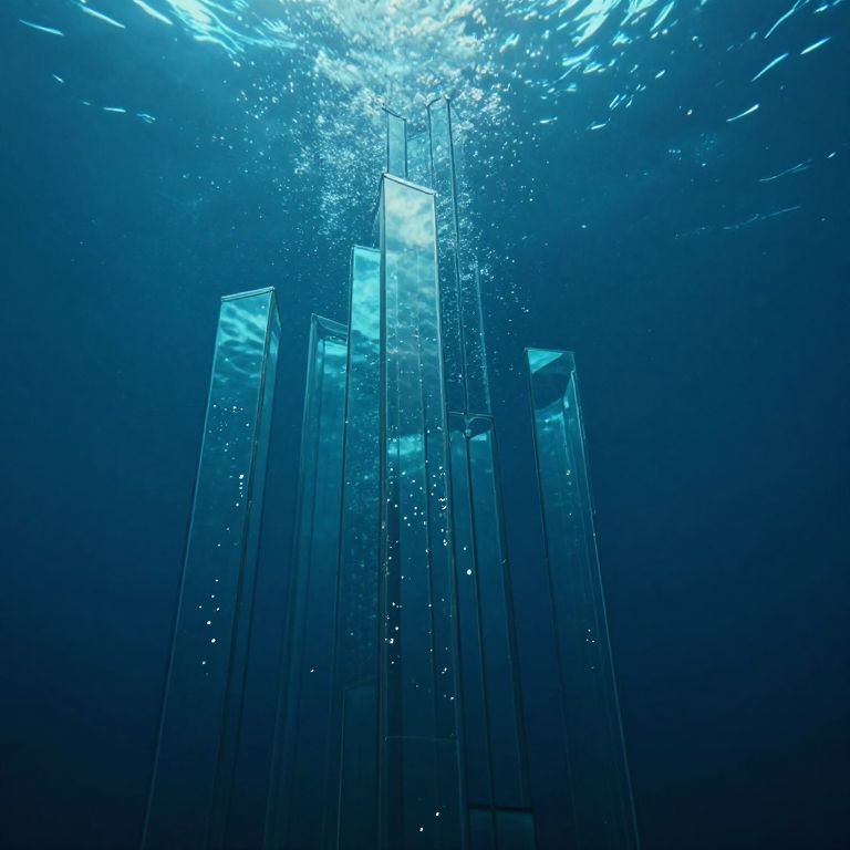 Translucent staircases ascend from the ocean depths, defying gravity as they merge seamlessly with cascading waves, creating an ethereal pathway to an unseen horizon.