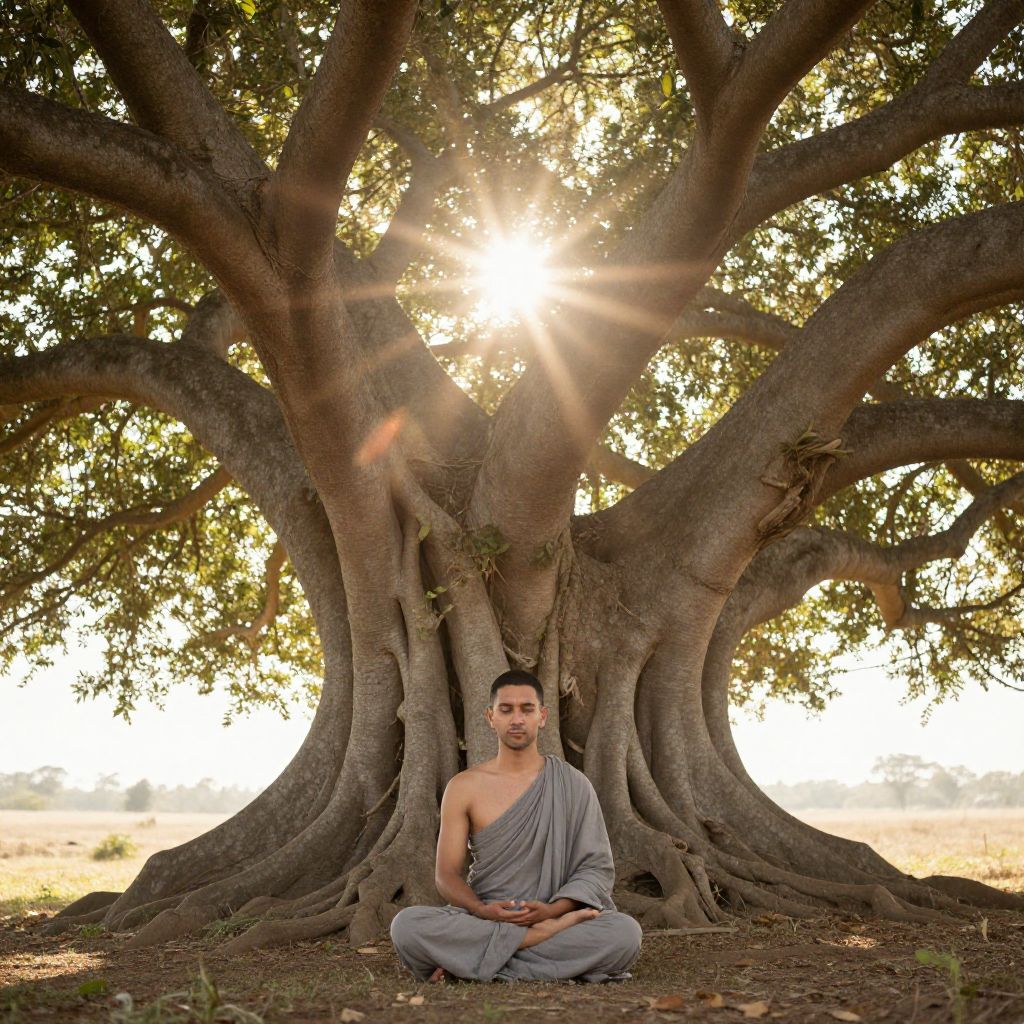 Photograph of a young, light-skinned man with short brown hair, sitting cross-legged in meditation under a large, sprawling tree with thick, gnarled branches. He wears a gray, single-shoulder dhoti and has a calm expression. The sun is shining brightly through the tree's leaves, creating a radiant halo effect. The background is a blurred, sunny landscape with dry grass and distant hills. The tree's textured bark and the man's serene posture create a peaceful, spiritual atmosphere. The lighting highlights the man and tree, emphasizing their prominence in the image.