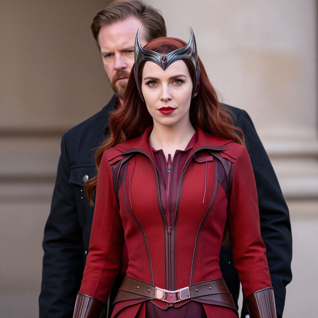 Scarlet Witch Costume Man, woman in a red jacket and black jacket with a horned headpiece