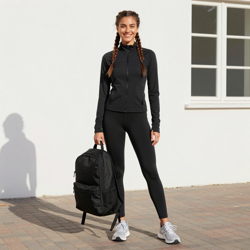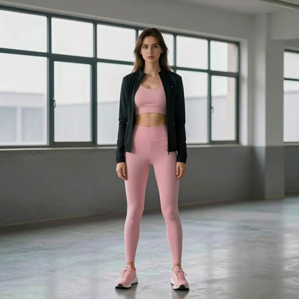 Full body portrait of a young woman standing on a sunlit sidewalk wearing a light pink long sleeve shirt, black leggings with pink and white patterns, and pink sneakers. She has long brown hair and is outdoors with green trees and grass in the background under a clear blue sky during daytime. The setting appears to be a suburban area with a casual style and natural daylight.