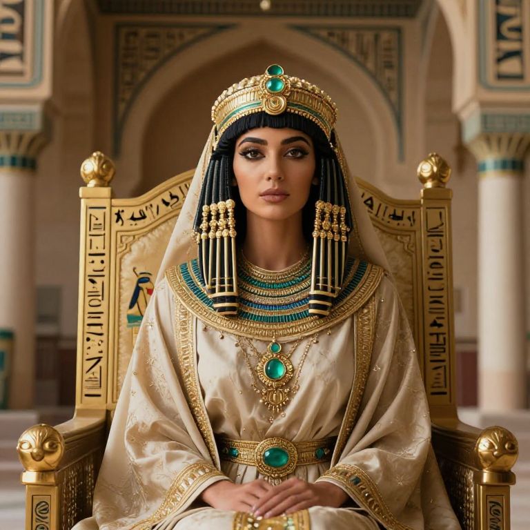 Create a portrait of Cleopatra envisioned as a Muslim queen, wearing a beautifully detailed hijab with gold and jewel adornments, seated on a throne with Egyptian hieroglyphics and Islamic architecture in the background, evoking cultural fusion.