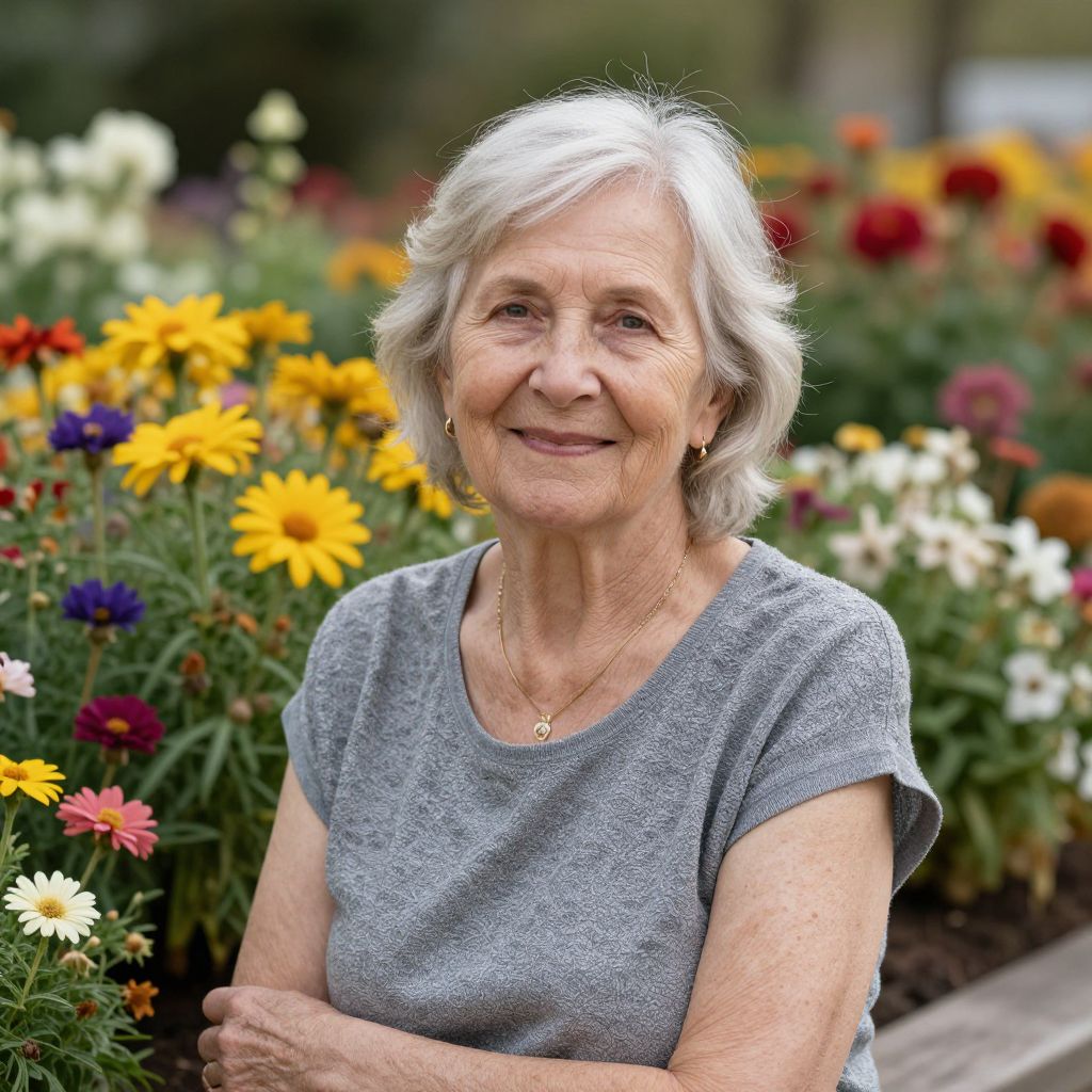 Photograph of an elderly woman with short, white hair, fair skin, and a gentle smile. She wears a light gray, short-sleeved shirt and a delicate gold necklace with a small pendant. Her arms are crossed over her chest. She stands in a vibrant garden filled with colorful flowers, including yellow, red, orange, and white daisies, and purple and blue blooms. The background is slightly blurred, emphasizing the woman and the flowers. The image has a soft, natural light, enhancing the warm and serene atmosphere.