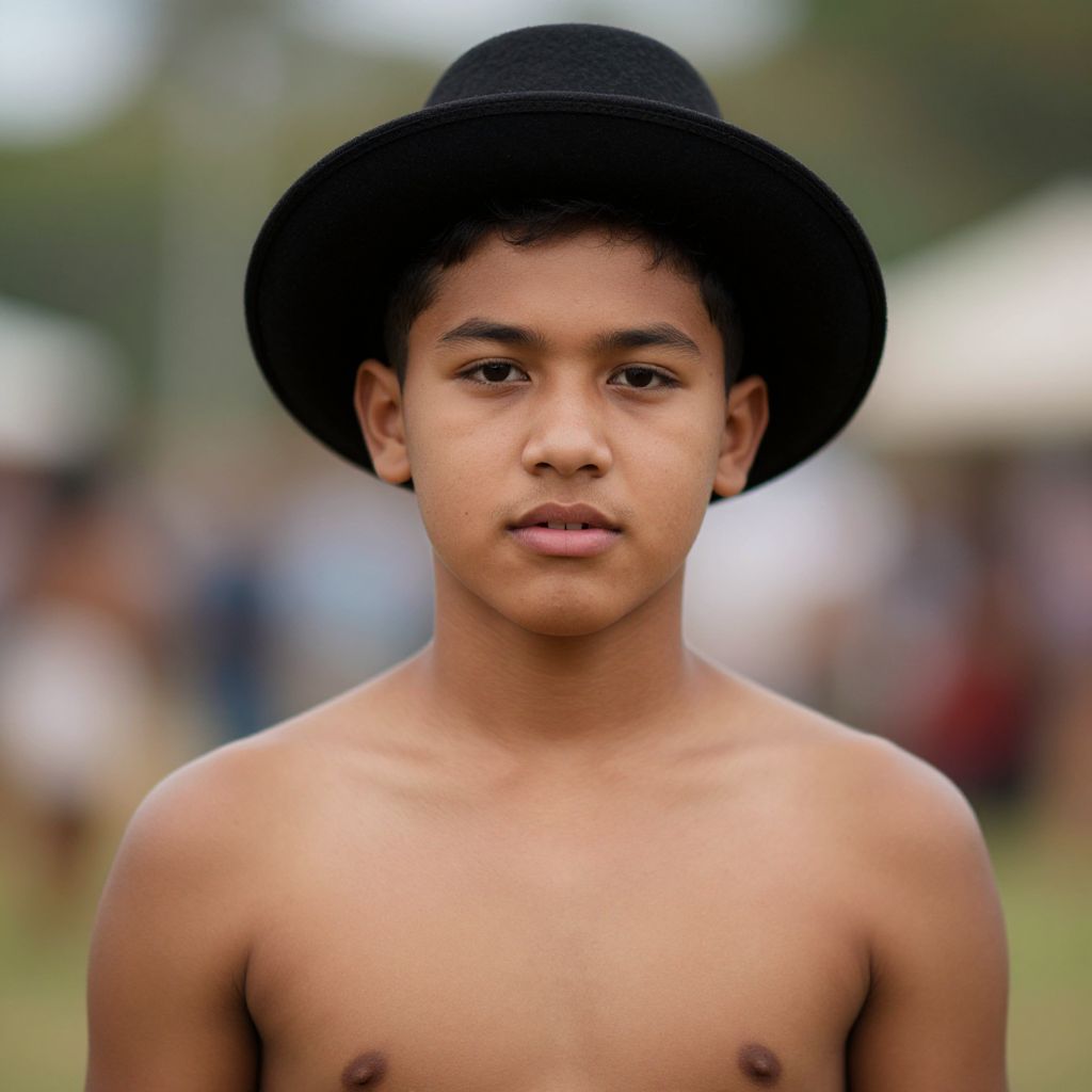 Photograph of a young, shirtless boy with light brown skin and short black hair, wearing a black wide-brimmed hat. He has a neutral expression and small nipples visible on his chest. The background is blurred with indistinct figures and greenery, suggesting an outdoor setting, possibly a park or fair. The boy is centered in the image, with a shallow depth of field that keeps him in sharp focus while the background remains out of focus. The lighting is natural, highlighting his facial features and hat.