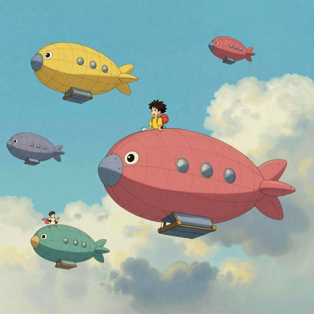 Studio Ghibli AI art generator depicting a fantastical sky adventure with airships and whimsical creatures flying among soft clouds, rendered in vibrant pastel colors and detailed linework, harmonizing AI creativity with classic Ghibli artistic motifs.