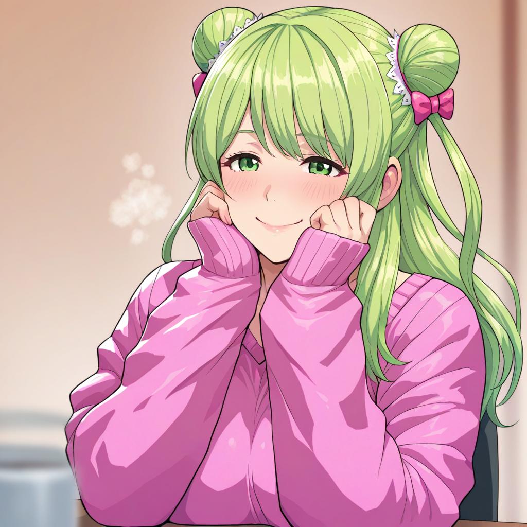Digital illustration of a virtual YouTuber character with long green hair styled in double buns, adorned with pink hair accessories and dark bows. The character has striking green eyes and a soft expression, wearing a pink long-sleeve garment with sleeves extending past the wrists, seated indoors near a window light source. The artwork is created in a detailed anime style.