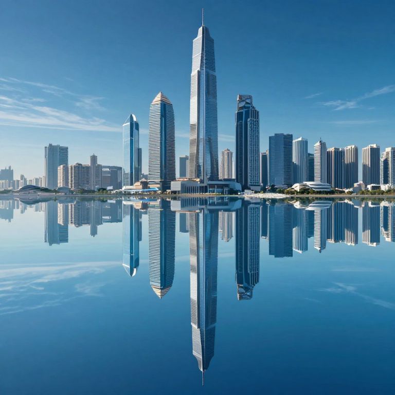 Photograph of a modern city skyline reflected in a calm, mirror-like body of water. The skyline features tall, sleek skyscrapers with glass and steel facades, predominantly blue and silver in color. The tallest building stands centrally, with other high-rises flanking it on both sides. The sky is clear and vivid blue, enhancing the reflection. The image is highly symmetrical, with the buildings and their reflections almost perfectly aligned. The water's surface is smooth, with subtle ripples, and the scene is brightly lit, suggesting midday sunlight.