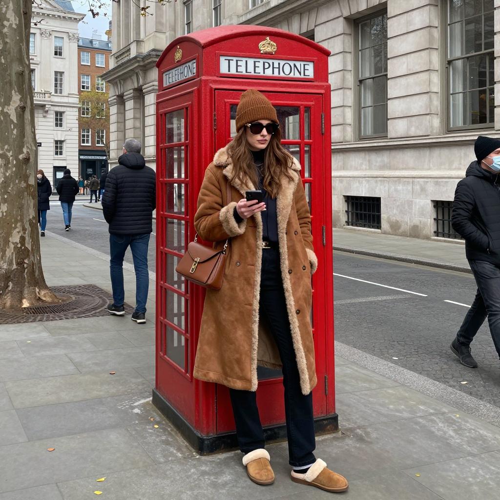 Photograph of a tall woman standing in a city square. She wears a brown beanie, sunglasses, a brown fur-lined coat, black pants, and tan slippers. She holds a smartphone in her right hand and a brown shoulder bag in her left. Her coat is slightly open. She stands in front of a red telephone booth and a stone building with tall windows and trees with sparse leaves. Several other people are in the background.