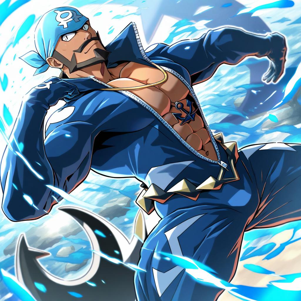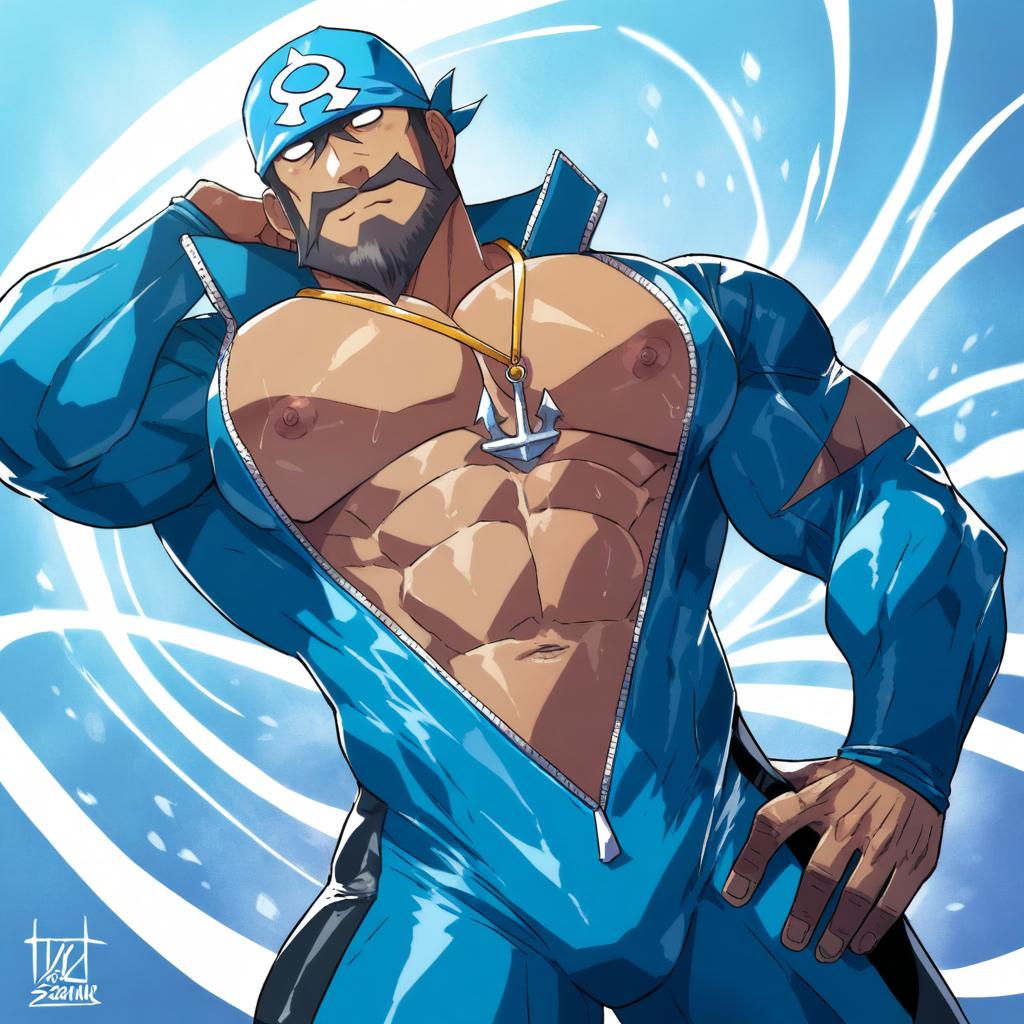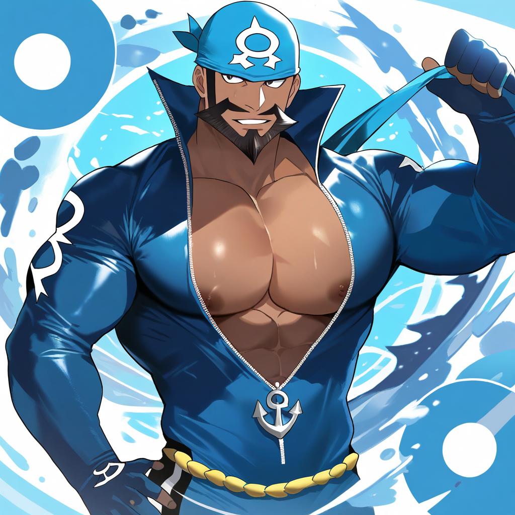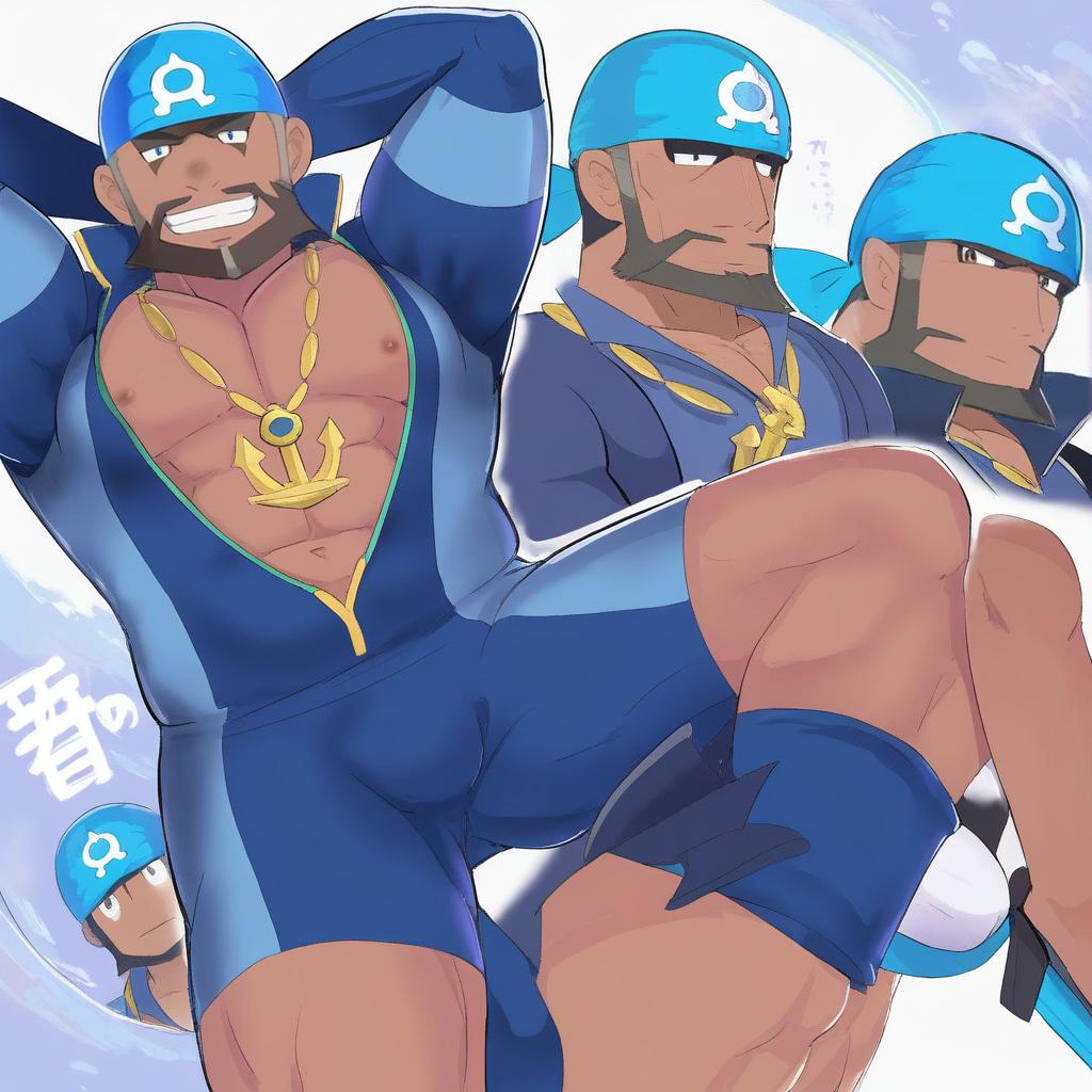 Archie (pokemon), pokemon, 1boy, dark-skinned male, mature male, beard, mustache, black eyes, short hair, black hair, brown hair, nipples, thick thighs, navel, blue bodysuit, anchor necklace, muscular male, bara, large pectorals, team aqua, abs, pectoral cleavage, blue bandana, team aqua, wetsuit, stomach, by artist amano kouki, illustrious