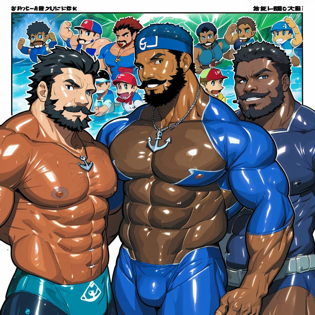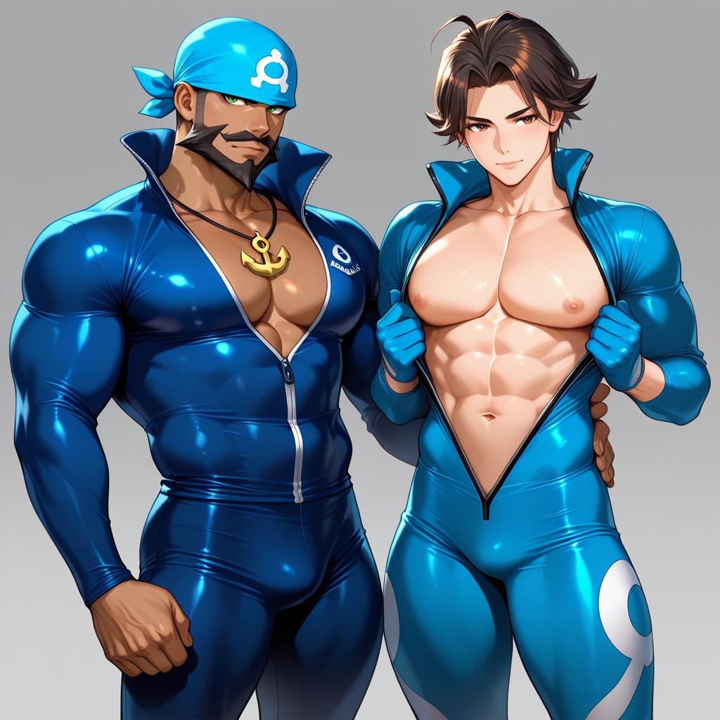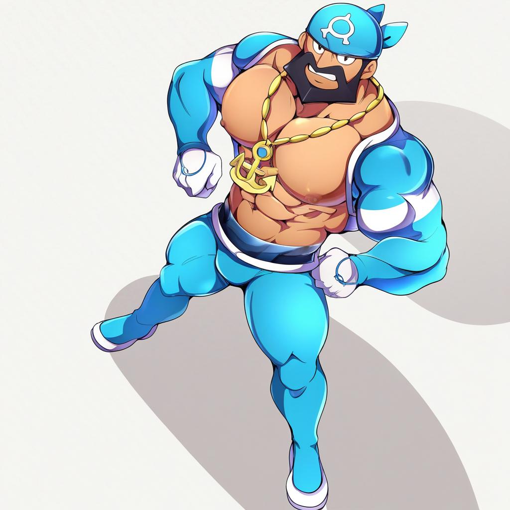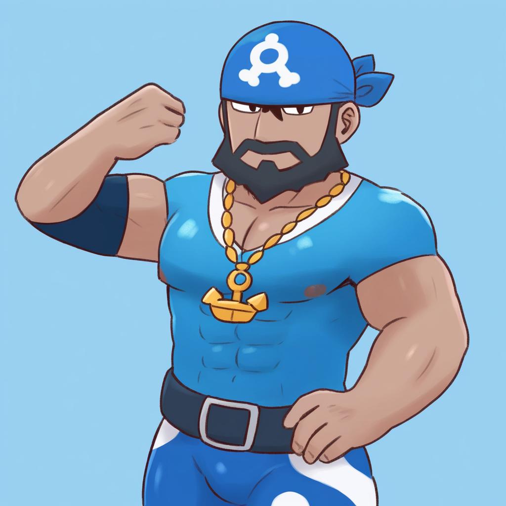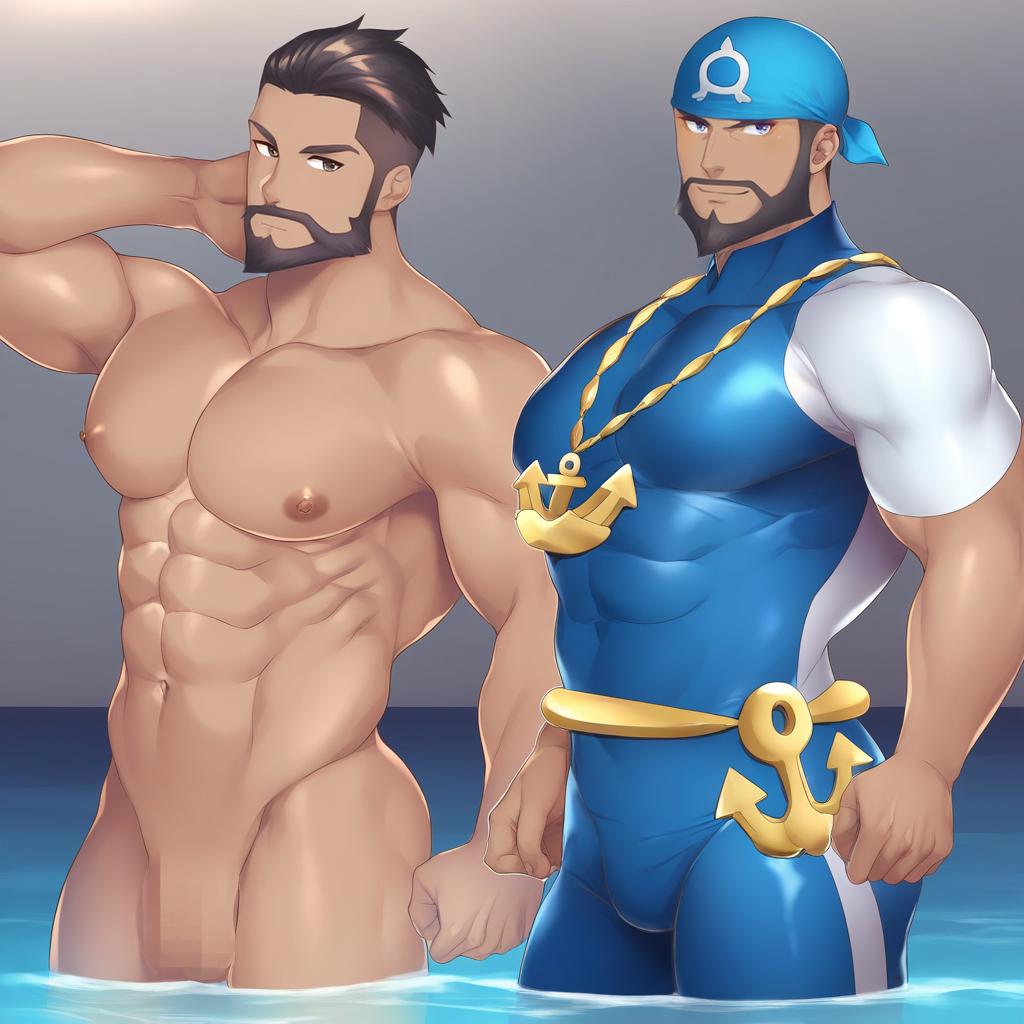 Archie (pokemon), pokemon, 1boy, dark-skinned male, mature male, beard, mustache, black eyes, short hair, black hair, brown hair, nipples, thick thighs, navel, blue bodysuit, anchor necklace, muscular male, bara, large pectorals, team aqua, abs, pectoral cleavage, blue bandana, team aqua, wetsuit, stomach, by artist amano kouki, illustrious
