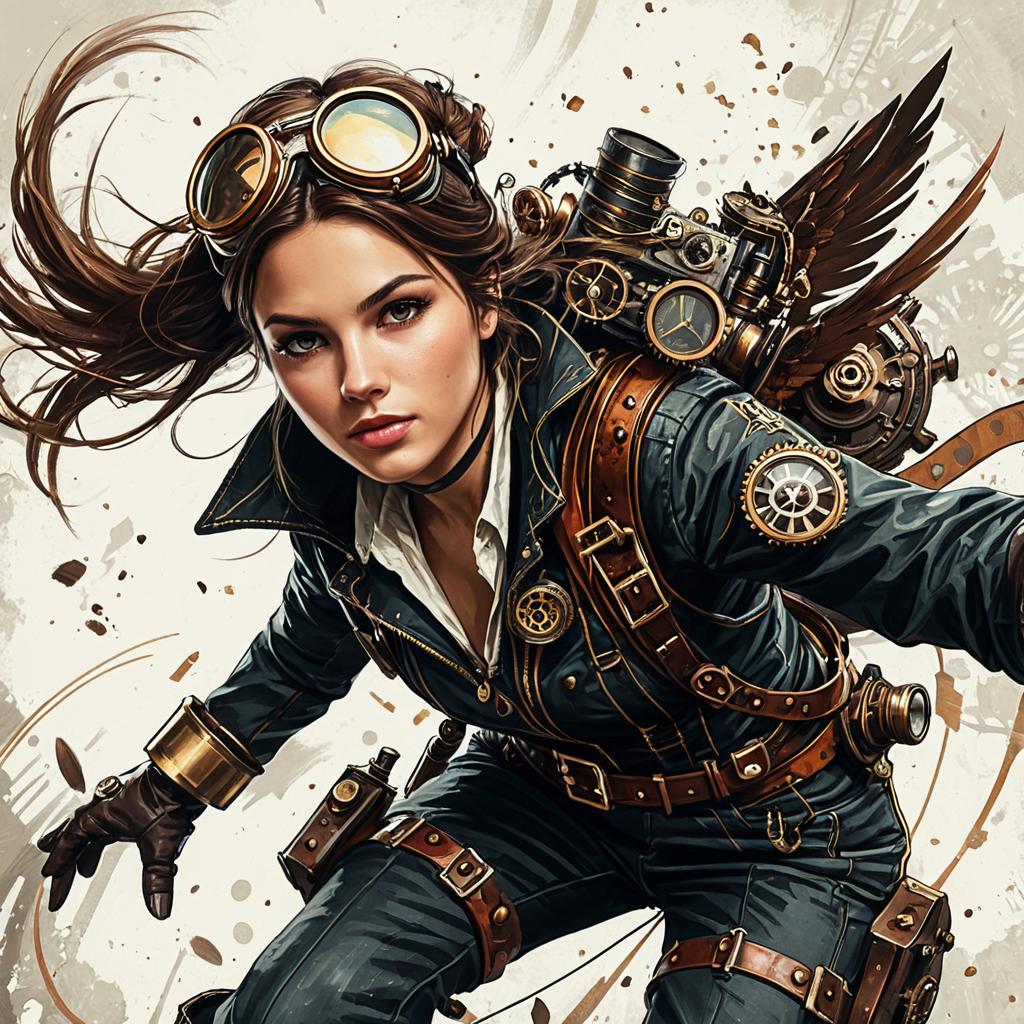 Pretty steampunk aviator girl, action pose, intricate details, digital painting by Melowh_art, brush strokes, energetic.